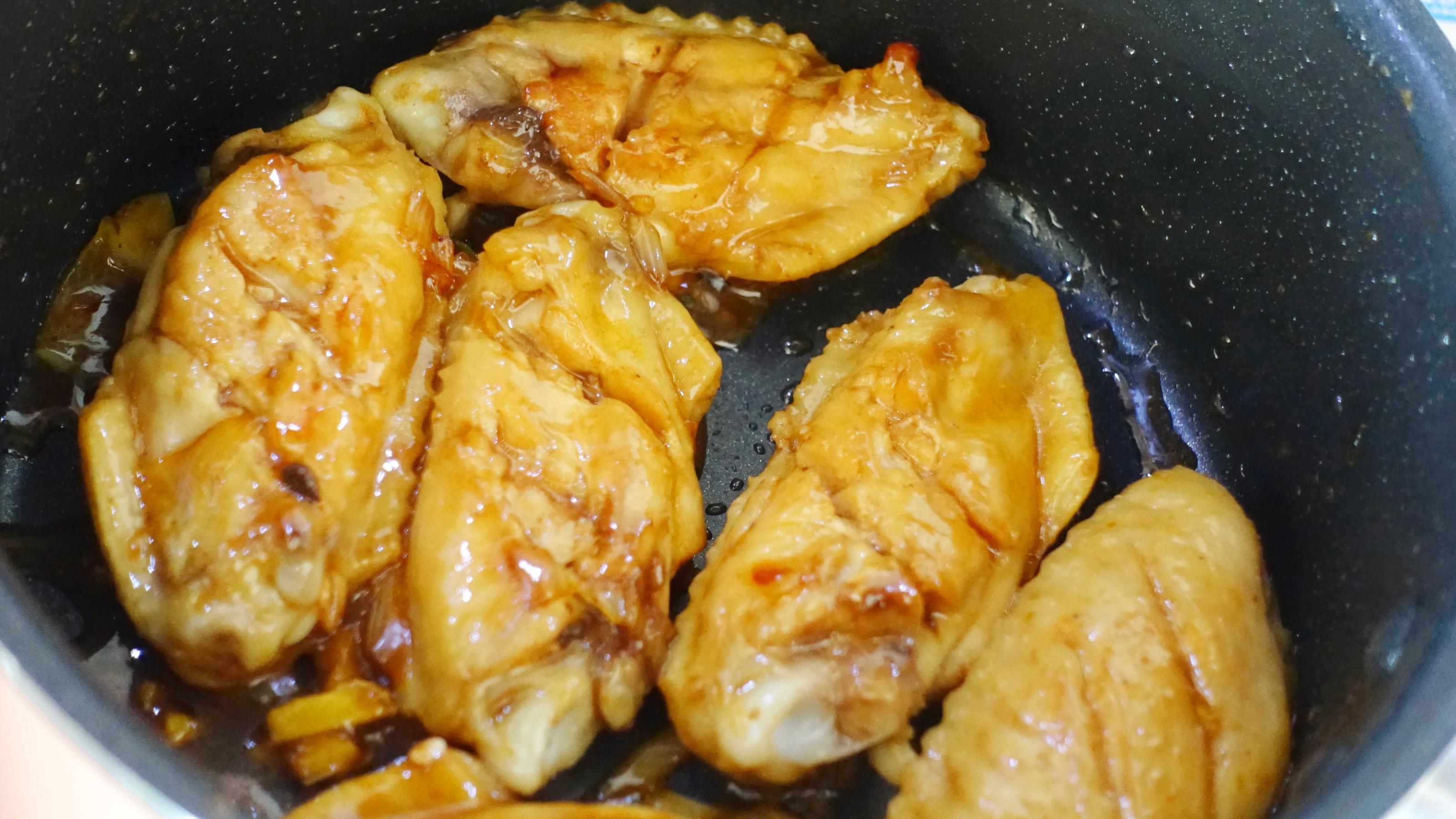 4、往鍋中加些薑末、蔥絲、生抽、蠔油,炒勻後倒入可樂,可樂的量要能沒過雞翅的一半以上;