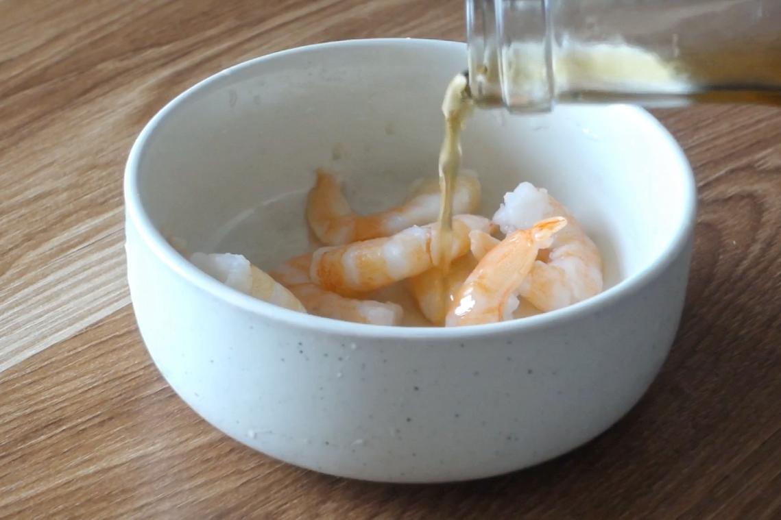 1、準備一些蝦仁,往裏面加些料酒、食鹽,抓勻醃製30分鐘;