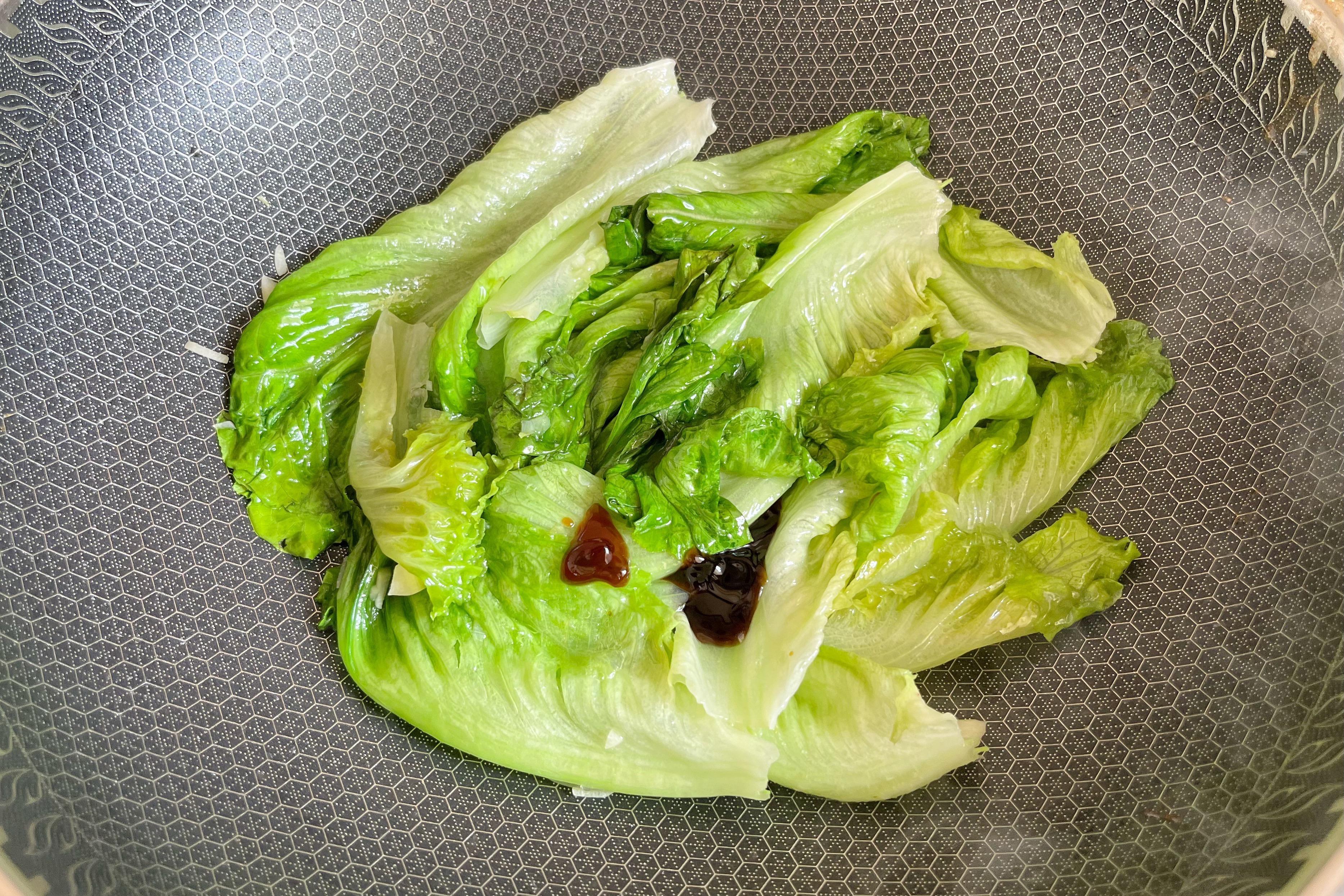 3、大火快速翻炒至生菜斷生,往裏面加些蠔油;