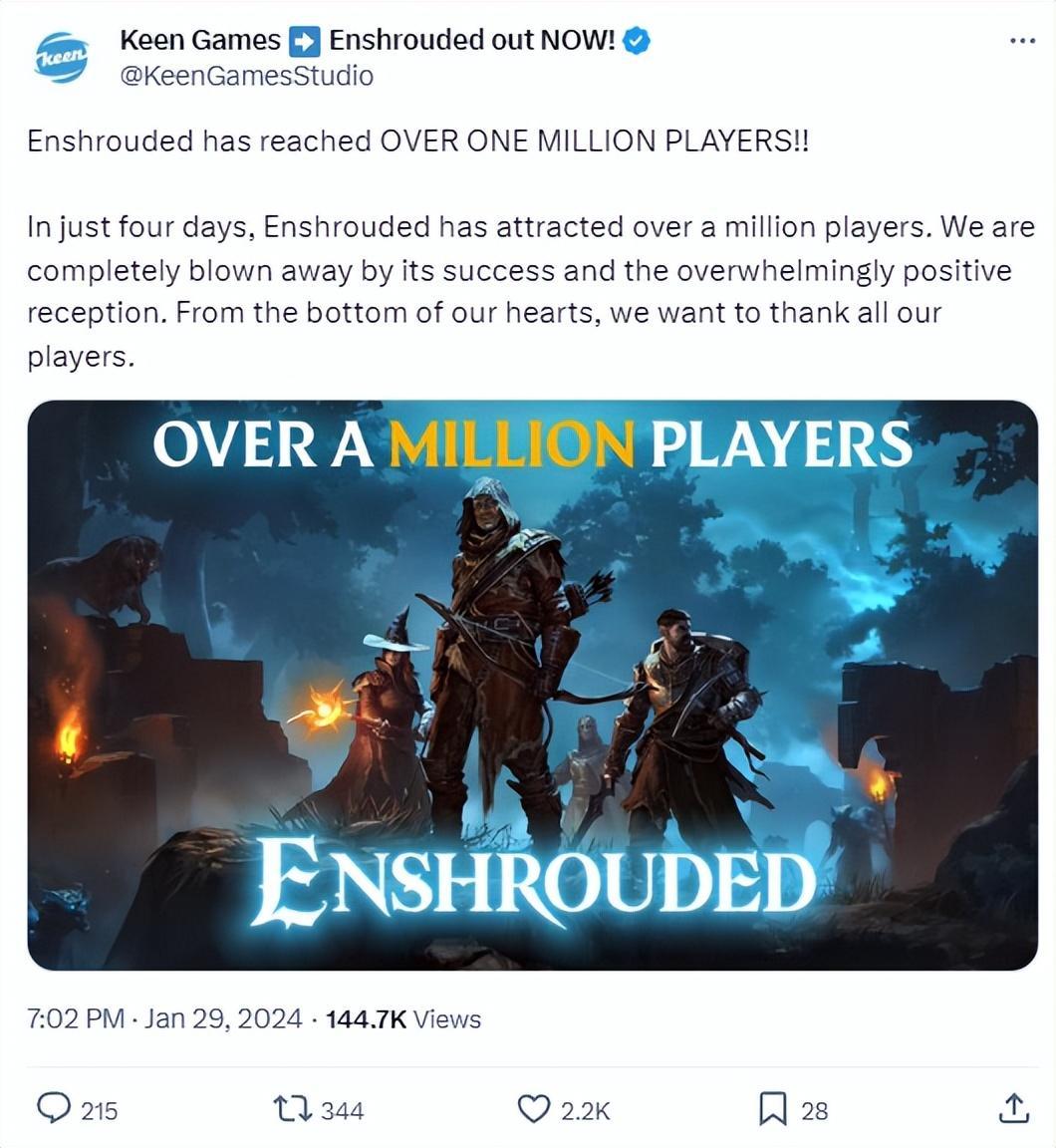 開發者Keen Games在推文中表示,他們對遊戲目前所獲得的成功和積極影響感到驚訝,並感謝了玩家。
