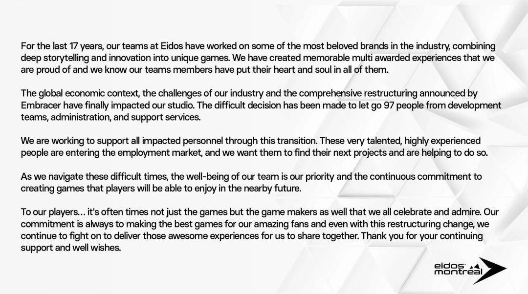 Eidos把裁員公告發在了自己的官推上。他們宣稱,出於全球經濟狀況和行業挑戰考慮,工作室做出瞭解僱一部分團隊成員的決定。