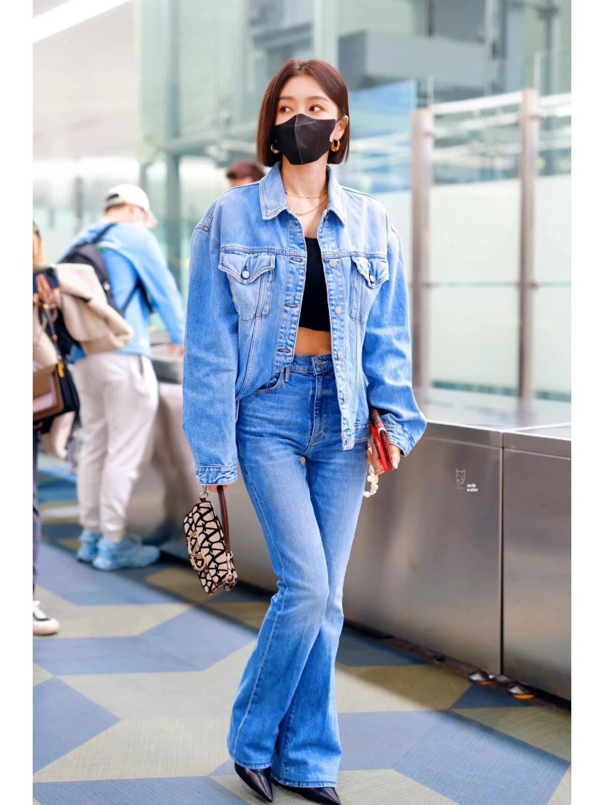 秦嵐的牛仔穿搭體現了復古回潮的趨勢,微喇褲搭尖頭鞋,既復古又時尚。微喇褲作爲一種經典的牛仔褲款式,具有強烈的復古感。它能夠修飾腿型,讓雙腿看起來更加修長。而尖頭鞋能夠增添女性的優雅氣質。將微喇褲與尖頭鞋搭配在一起,不僅能夠展現出復古的風格,還能夠讓整體穿搭更加有女人味,體現了秦嵐將款式的細節處理的很到位,使穿搭精緻且優雅。牛仔套裝要避免過於寬鬆或過於緊身的款式。