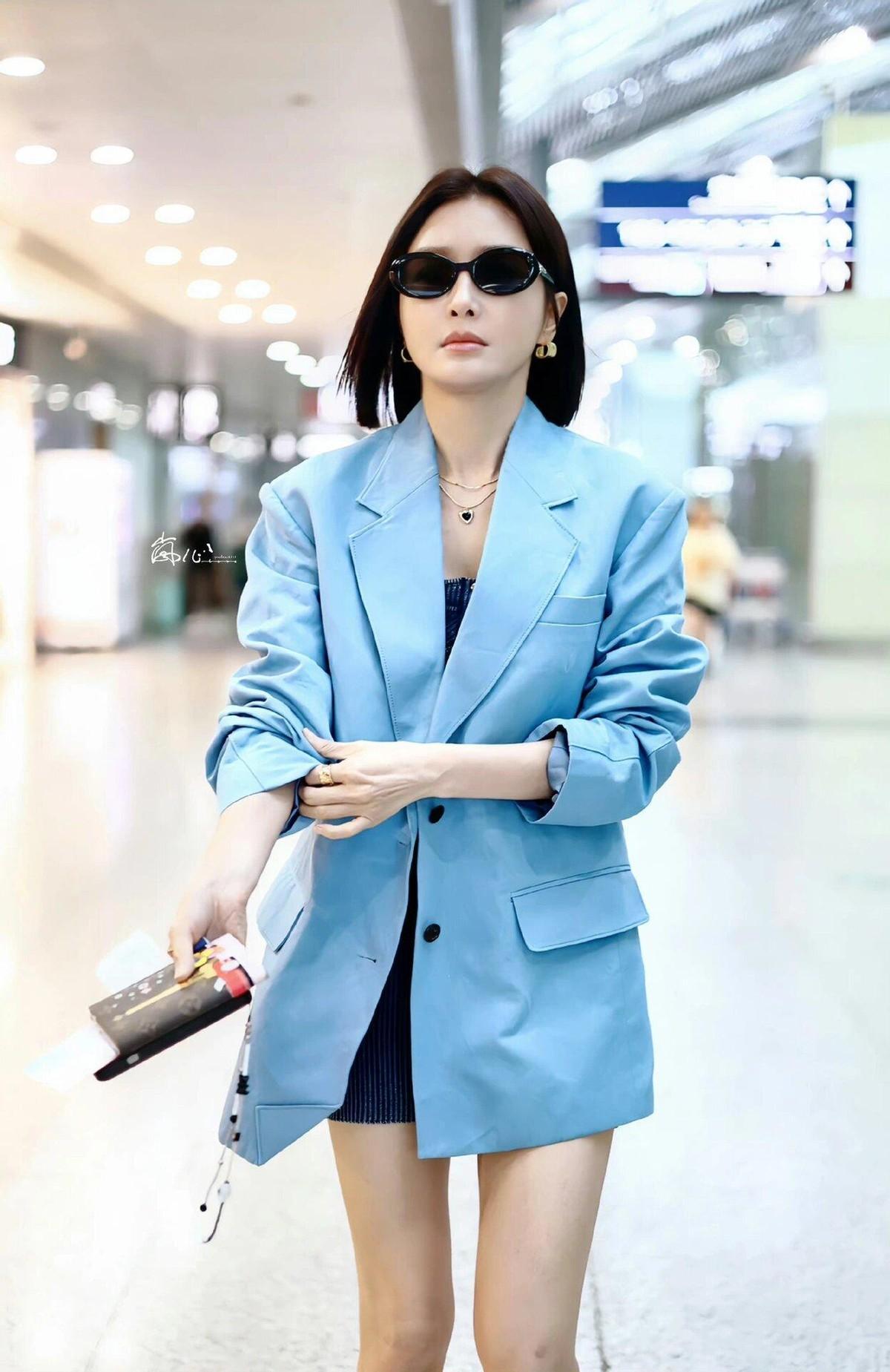 經典的黑色配飾百搭實用,在秦嵐這套穿搭中也十分吸睛,藍色系衣服搭黑色系配飾,一看就是酷颯大姐姐專屬look。秦嵐善於運用各種配飾來提升整體造型的時尚感。在這套穿搭中,她選擇了經典的黑色配飾,黑金的耳環、項鍊、挎包和黑色墨鏡,這些配飾能夠很好地襯托出藍色系衣服的高級感。藍色系的衣服給人一種清新、優雅的感覺,而黑色系的配飾則增添了一絲神祕和酷颯的氣質。喜歡或想嘗試成熟穩重的女性不要錯過她的穿搭。