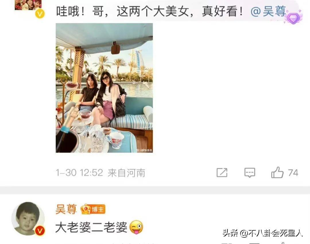 有網友就這組合照給吳尊留言,他的回覆是大老婆二老婆,此言一出,迅速登頂熱搜,備受爭議。