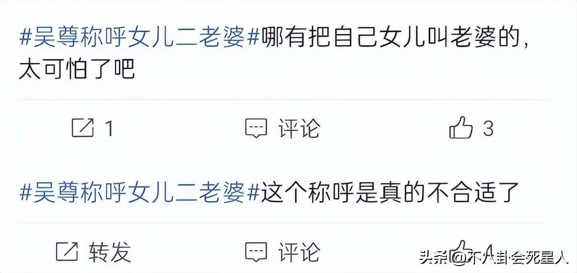 對此,不少網友吐槽吳尊沒邊界感,哪有人將自己女兒說成是老婆的,完全可以說是大寶貝二寶貝,或者大可愛小可愛,應該換個說法,直言他這樣很下頭,遭到大衆的批評後,吳尊刪除了那條回覆網友的言論。