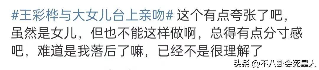 前不久,臺灣藝人王彩樺與女兒同臺錄製除夕特別節目,母女倆在臺上嘴對嘴接吻,親吻時間長達20秒,震驚全場。