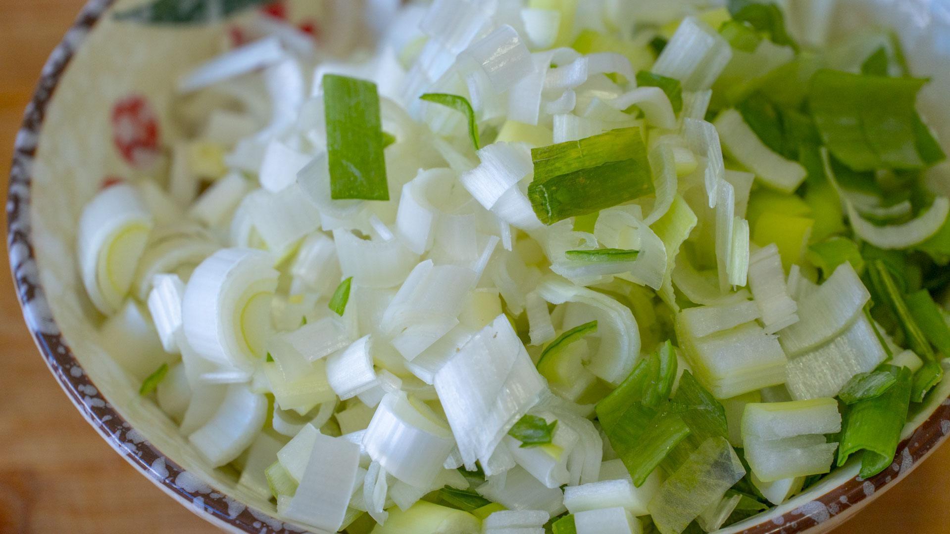 2、白菜一小顆 ,只要葉子部分 切碎;1根大蔥,切成蔥花;