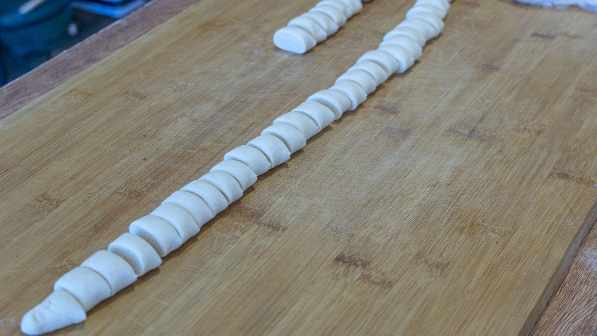 6、麪糰兒從中間搓個洞後轉幾圈,掰開後分成兩份,搓長搓細,然後分成小面劑,一份可以分成30個。