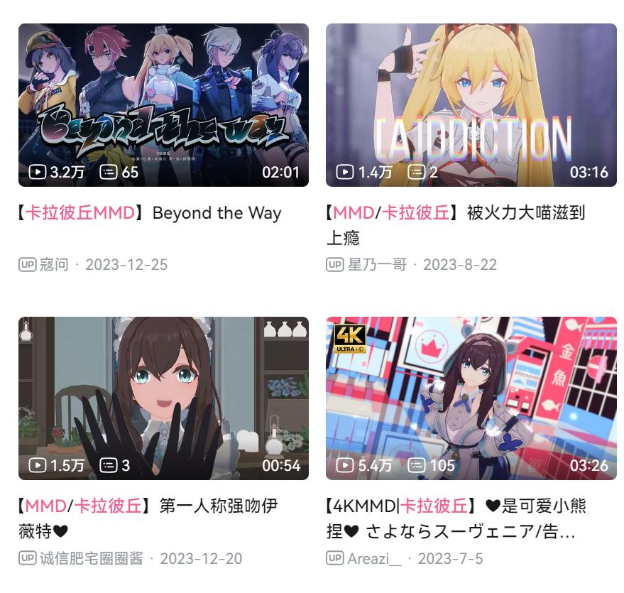 更重要的是在這之後,玩家們顯然進一步發現了《卡拉彼丘》中角色們的潛力,成爲了舞蹈類MMD視頻的熱門常客。