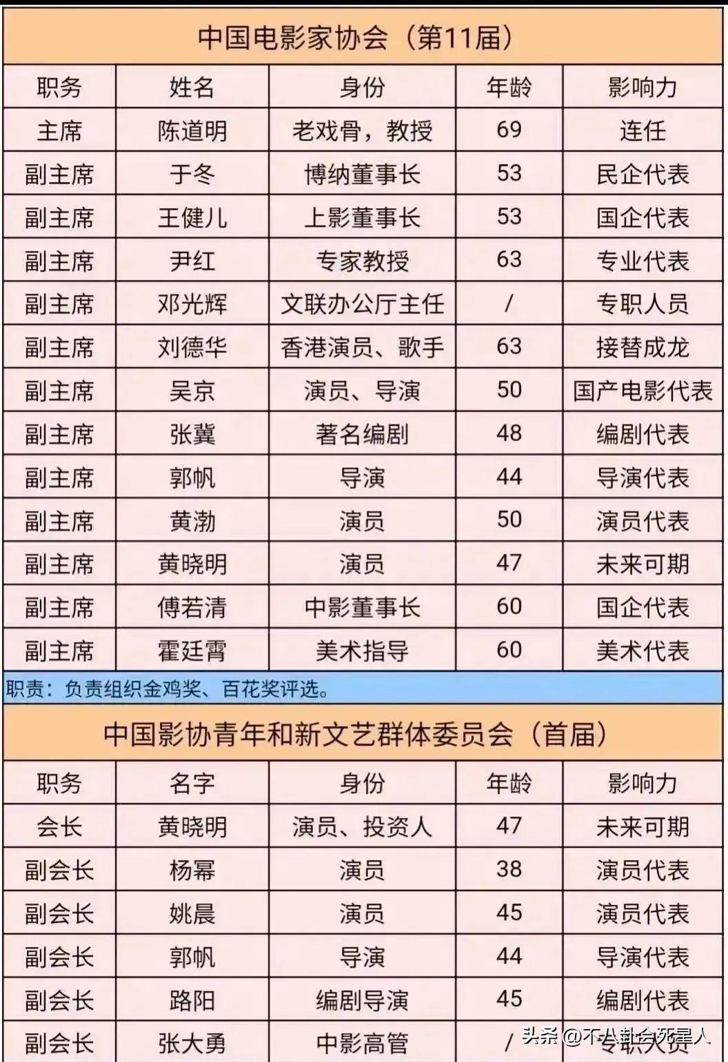 “影協副主席”的則有來自各界的12位代表,其中是演員身份的有吳京,劉德華,黃渤和黃曉明。