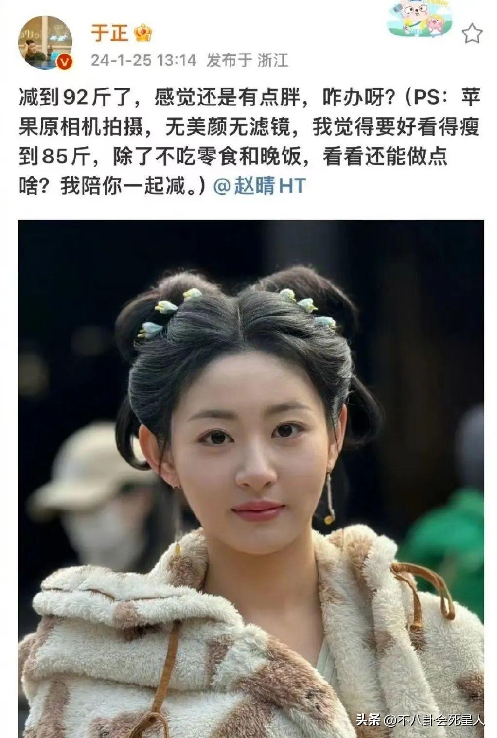 就拿於正來說,他的新戲《五福臨門》正在拍攝中,要求旗下女演員趙晴,瘦到85斤。而目前趙晴92斤,她身高是1米7,這樣的身高體重其實已經非常瘦了。