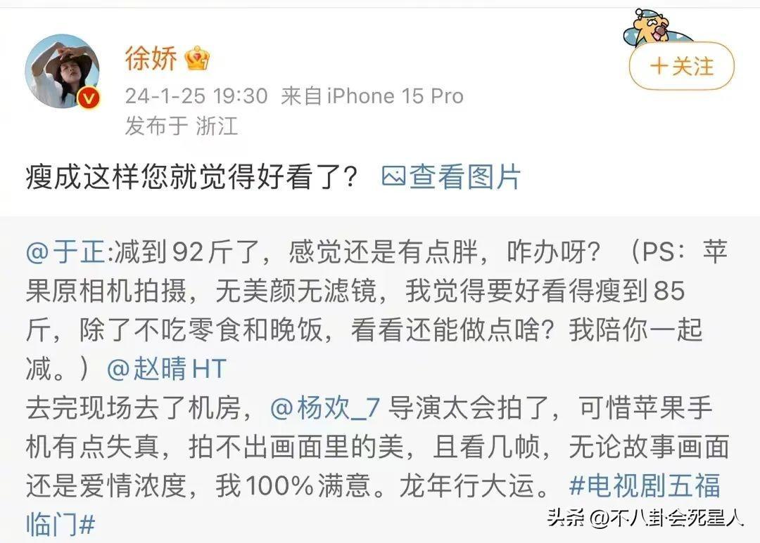 於正要求的85斤,對於一個1米7的人來說,實在太嚴苛,徐嬌看不下去,甩出一張於正旗下男演員的圖片,回懟,“瘦成這樣您就覺得好看了”?