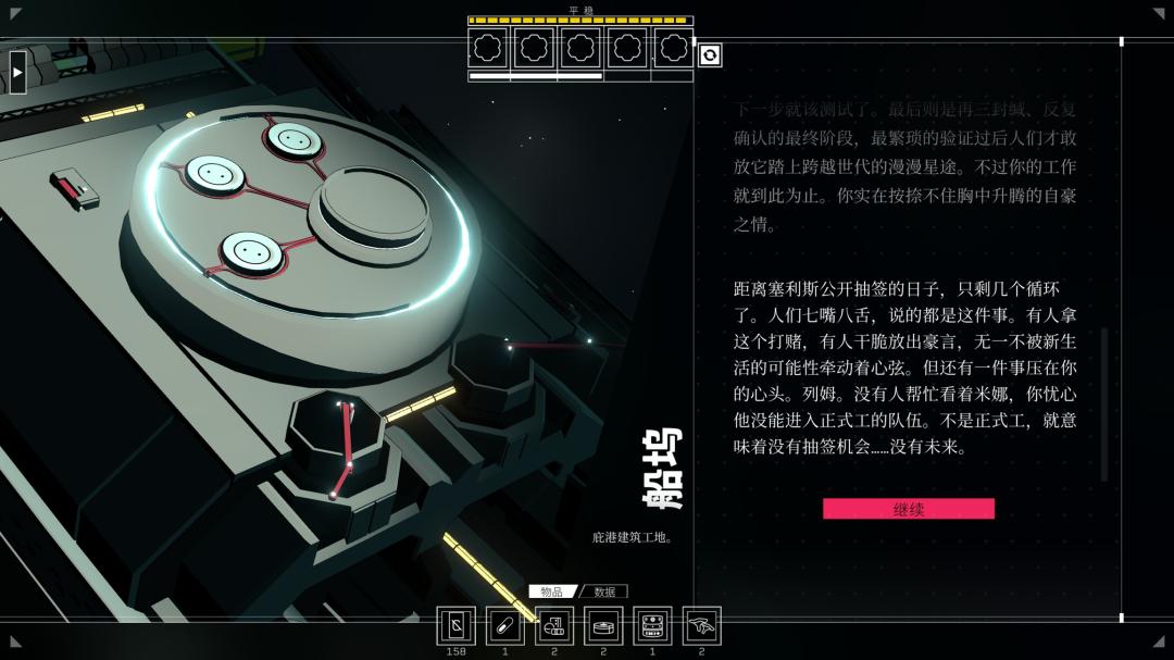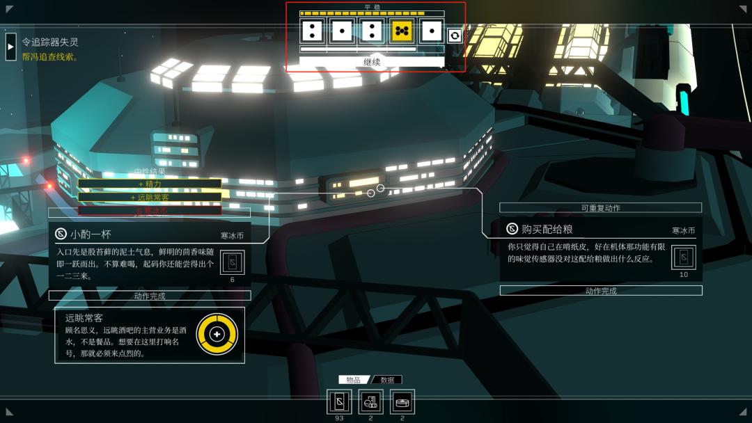 相比ADV遊戲來說,它更像是一個模型比較簡易的TRPG。在每個循環(可以姑且理解爲“一天”)中,玩家會獲取一定數量的骰子,每個骰子可以讓你在飛船上進行一次行動——可以是通過各種劇情相關的檢定、可以是在“裏世界”解鎖賽博空間的祕密,但最主要還是用於維持你的生存。