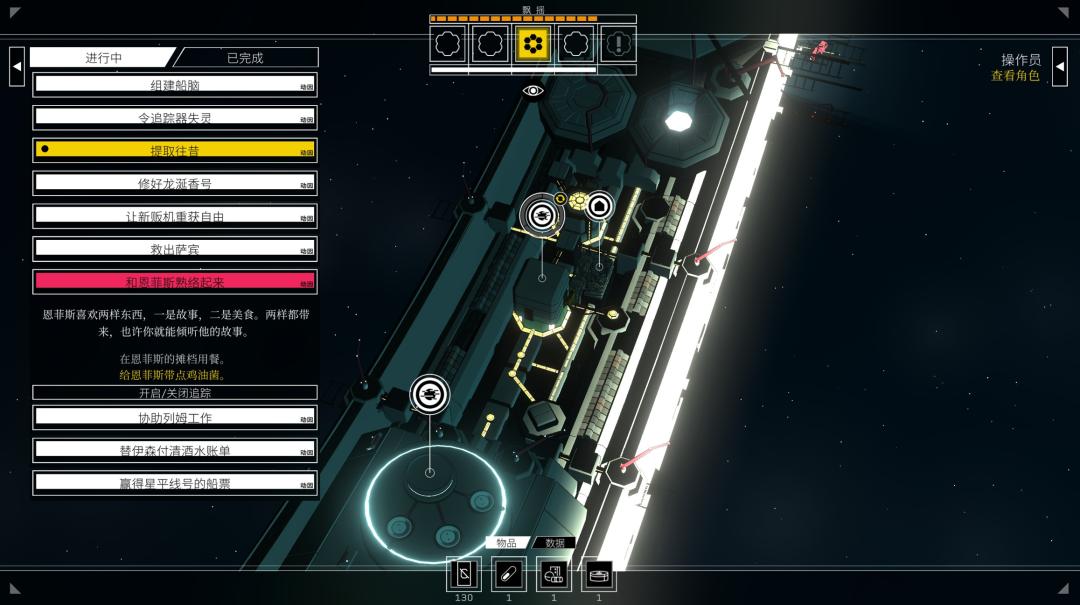 是的,儘管劇情的線性程度相當高,但《深空夢裏人》的核心玩法甚至可以說是生存模擬。兩條不同的生存屬性量表,時時刻刻會給玩家的行動帶來壓力,加上不少任務都具備倒計時限制,如何規劃每個循環的流程、不至於餓死的同時又能推進劇情,成了夢遊體必須思考的事項。