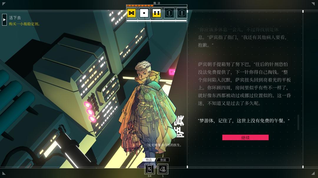 而這個時期,我已經因爲努力推進劇情而捉襟見肘:能力還沒提升夠,工作經常弄出“工傷”還拿不到工錢;健康狀況一直在惡化,而穩定劑價格高昂;飯錢更是每天一大開銷,往往只能和勞動所得勉強相抵。在這種情況下,我還要努力去應對殺手的勒索,畢竟他手裏有槍,而我只是個沒搞懂自己身世的可憐夢遊體。