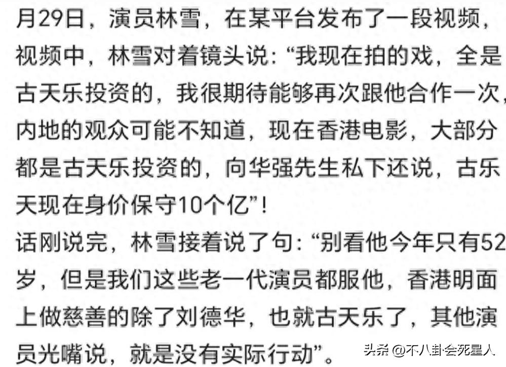 演員林雪曾經說過,現在香港拍的大部分電影都是古天樂投資的,他拍的戲都是古天樂投資的,雖然古天樂才53歲,但香港老一輩的演員都很服他,香港明面上做慈善的除了劉德華就是古天樂了,其他人都只是說說而已。