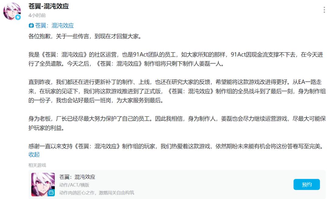 今天下午,《蒼翼:混沌效應》製作組91Act發佈公告,表示目前因資金流無法繼續支撐運轉,公司只能選擇遣散團隊除製作人姜磊外的所有人。
