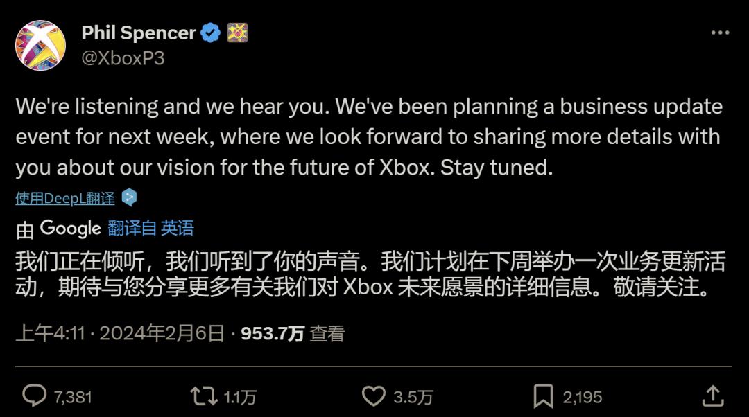 今日凌晨,微軟遊戲部門CEO菲爾•斯賓塞終於在推特上宣佈,下週將會向粉絲們分享更多關於Xbox未來願景的細節。