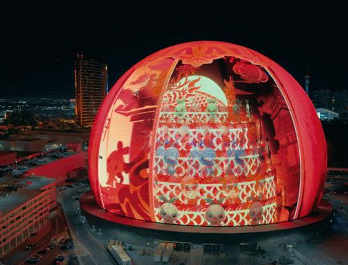 而在臨近春節之際,Sphere場館,或者說整個當地城市,都在前幾天迎來了“最有中國年味兒的一集”——一個高111米,直徑157米的“大紅燈籠”在這裏升起,掛了一晚上。