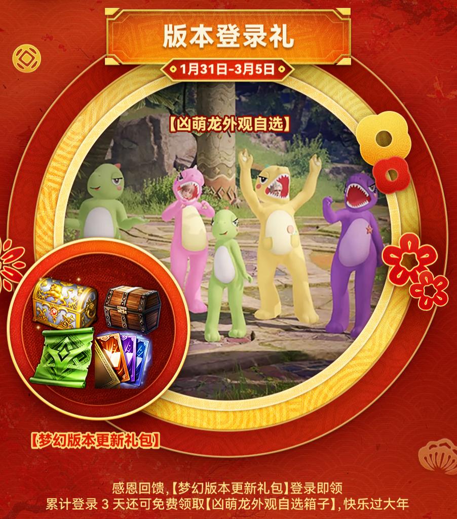 在過年期間,僅是登錄或是完成一些簡單任務,就能得到多種外觀飾品和寵物,此外也能少不了各種強化角色用的素材禮包,可以說無論新人入坑還是老玩家迴歸,都是個好時機。