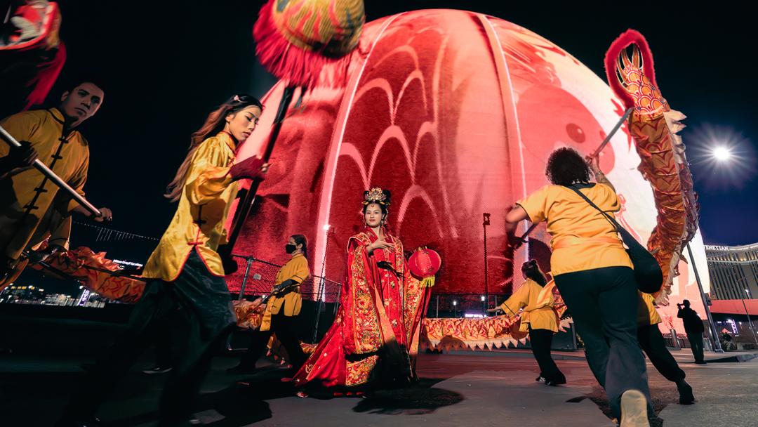 其實除了這個當今最大的“電子燈籠”,當天在Sphere附近還舉行了一系列現場活動,包括舞龍舞獅、漢服展示,向當地的遊客們發放春聯與紅包……總之讓當晚的拉斯維加斯拉滿了中國年味兒。