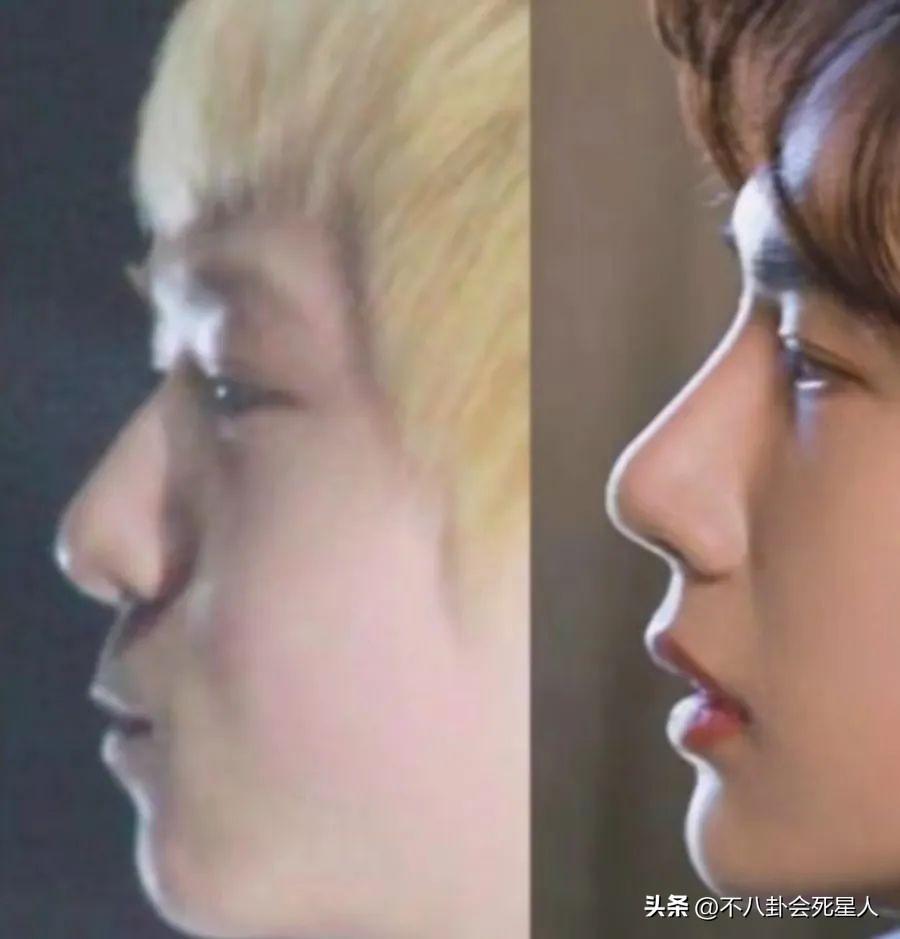 網上有一組王一博側臉照的對比圖,他的鼻型變化很大,原來圓潤的鼻尖,弧度變得更高。