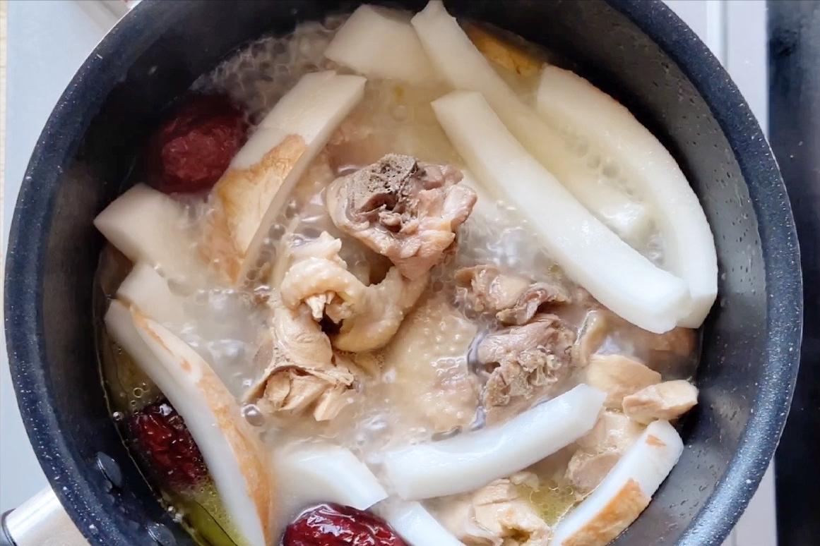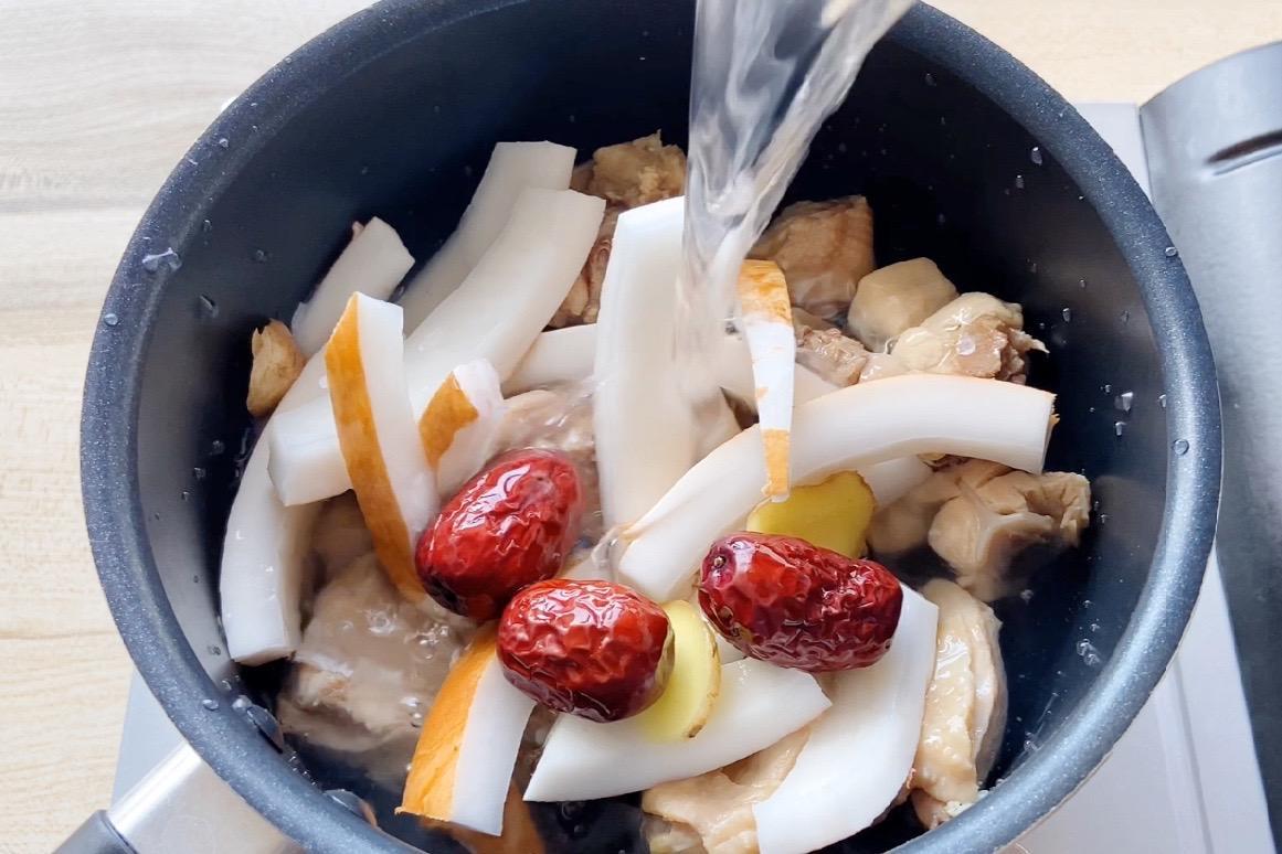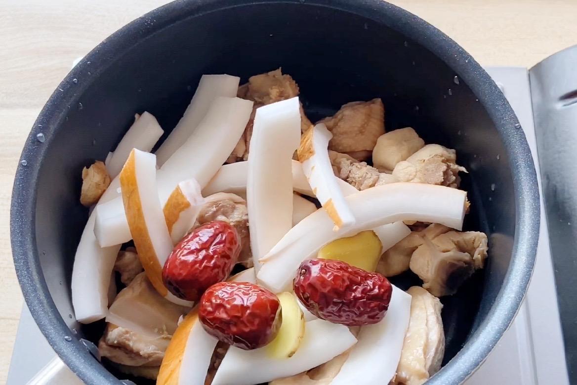 2、將雞肉加入湯鍋中,再放入適量切成條狀的椰子肉,加幾顆紅棗、幾片生薑;
