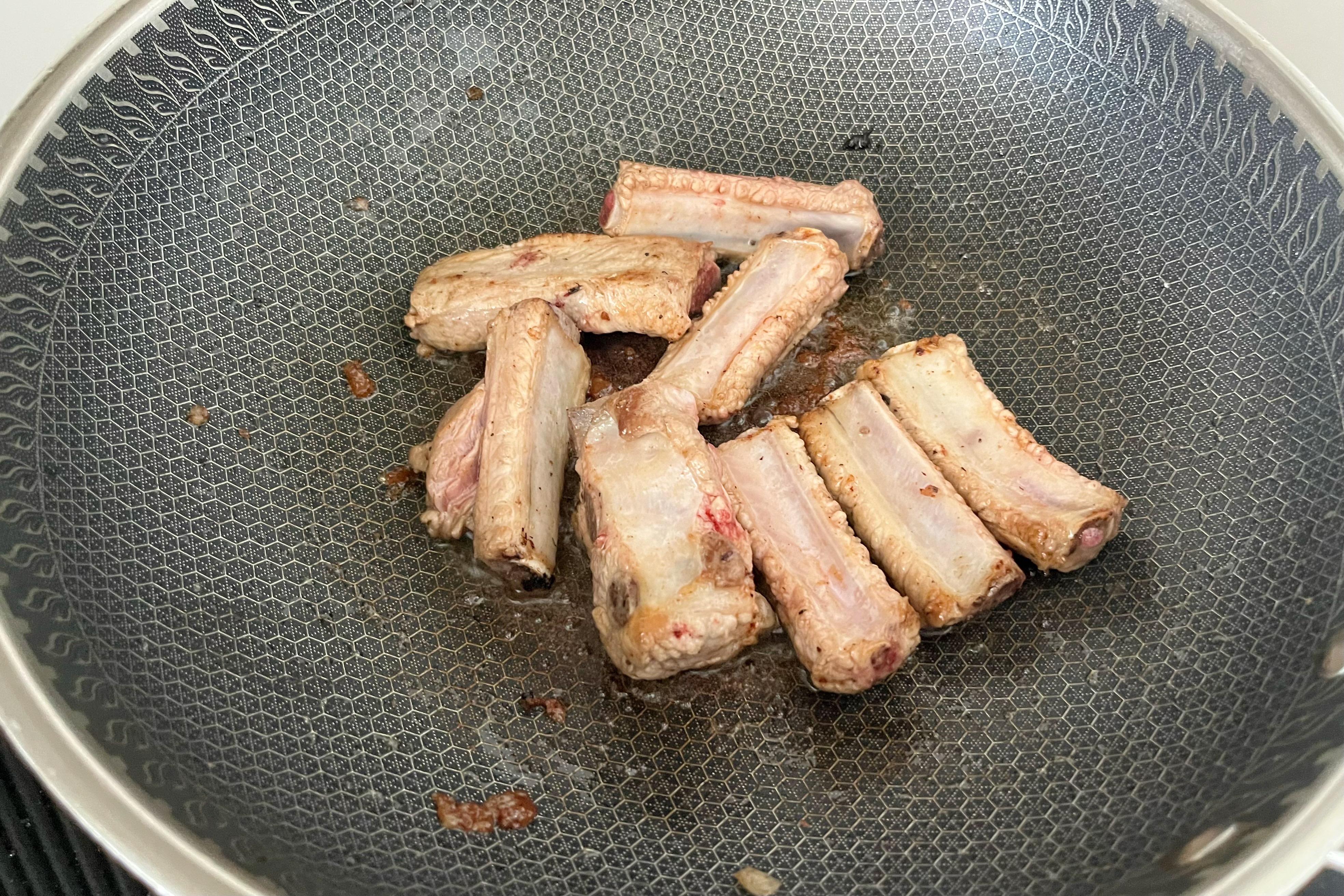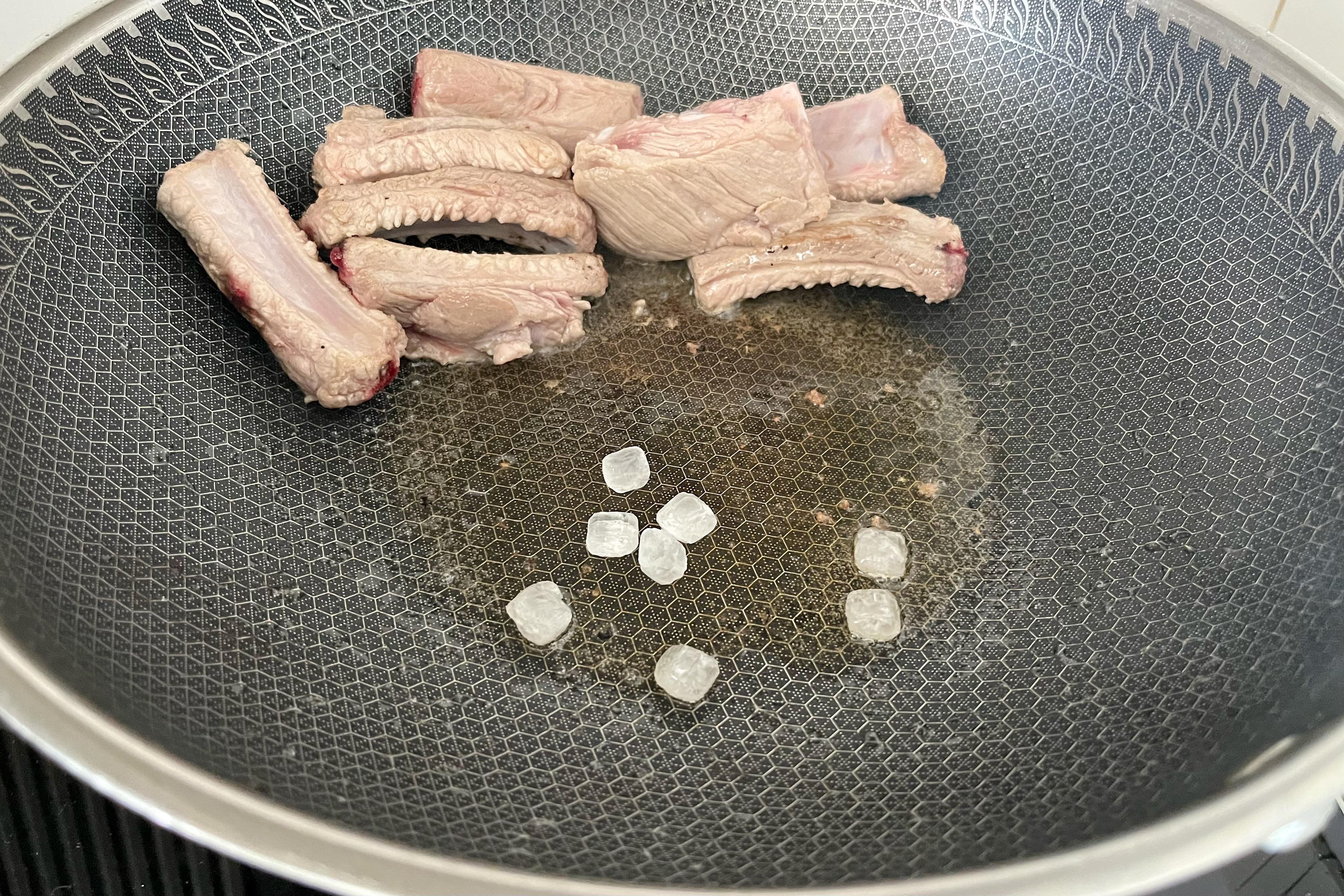 2、鍋中加油,下排骨,小火慢慢煎至兩面變焦黃,再放入少許冰糖;