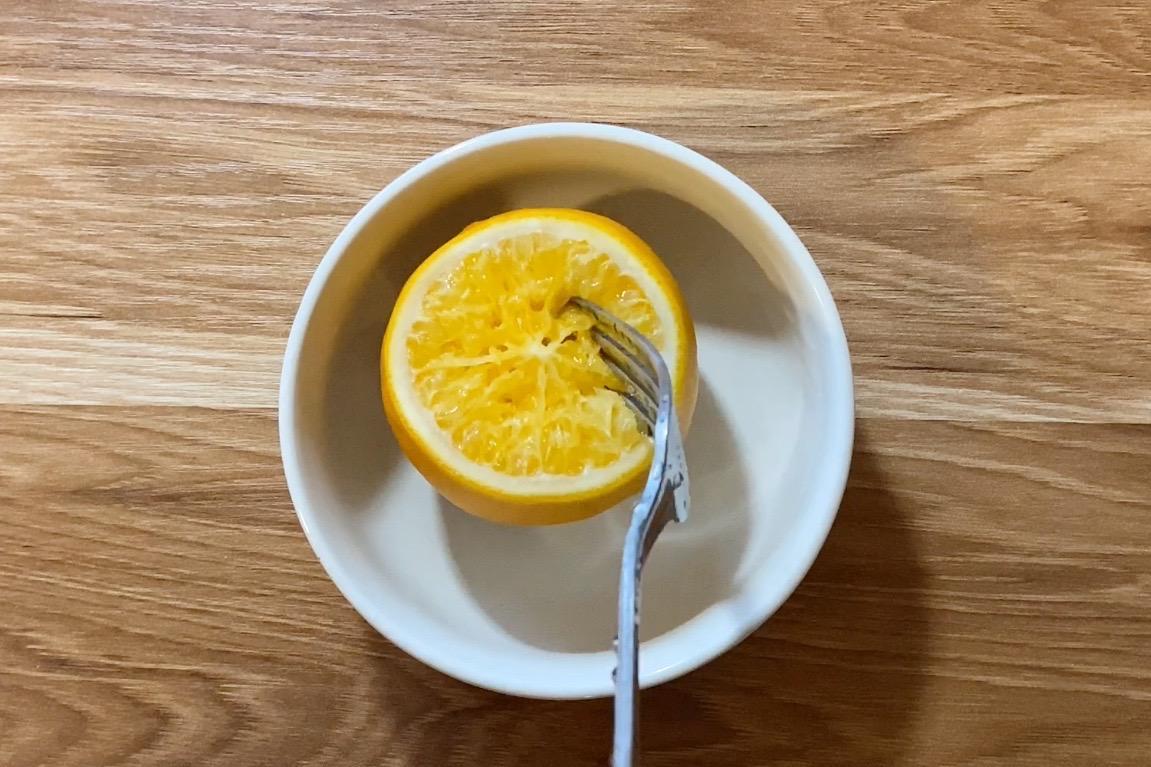 3、用叉子將橙肉叉松,表面撒少許食鹽;