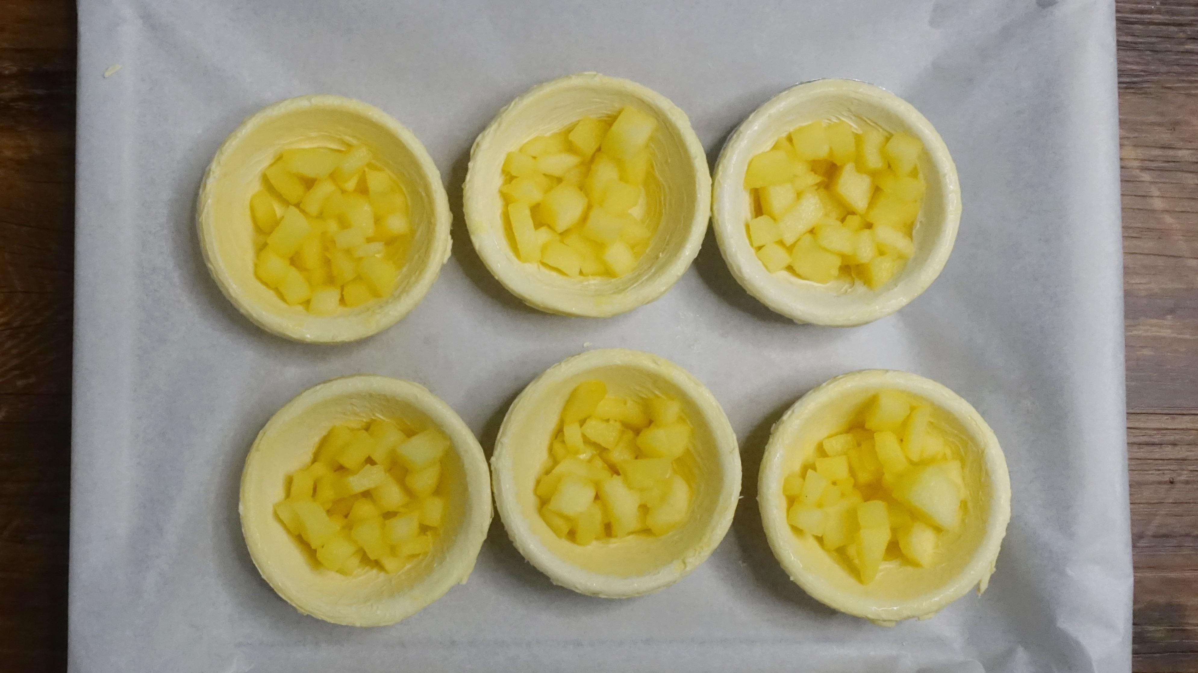 4、往蛋撻皮中加適量蘋果丁,8分滿即可,再對摺蛋撻皮,邊邊捏上花紋封口;