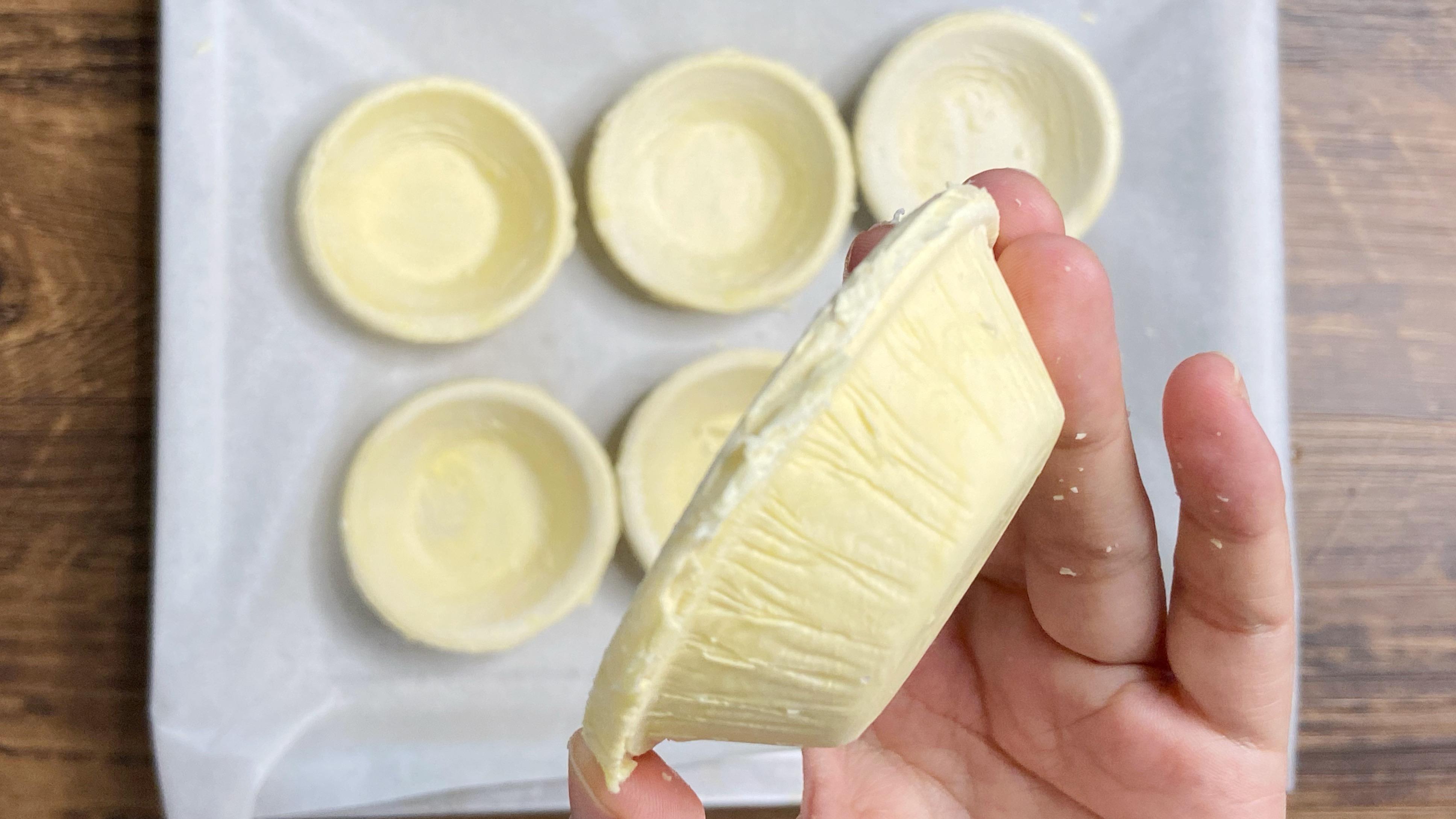 3、準備一些現成的冰凍蛋撻皮,趁着還沒化凍,將外層的錫紙去掉;
