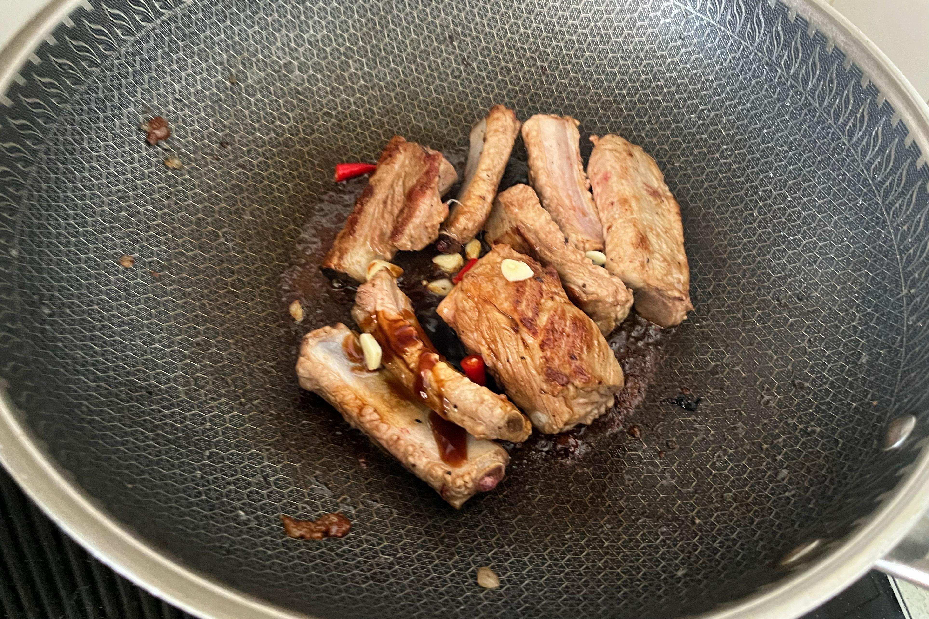 3、小火將冰糖炒化後,和排骨混合在一起,翻炒至上色;