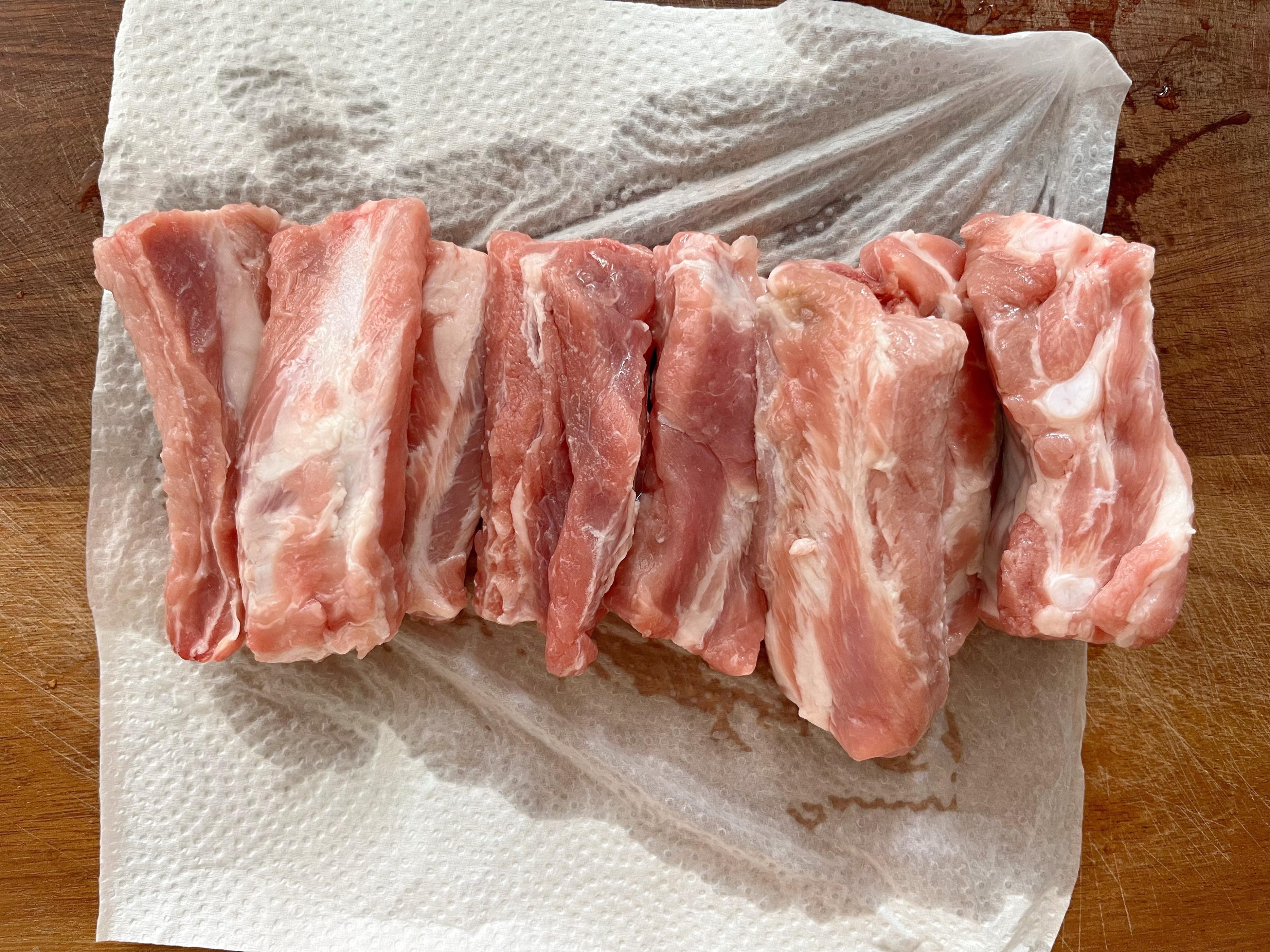 1、準備一些新鮮的排骨,洗淨後,用廚房紙擦乾表面的水分;