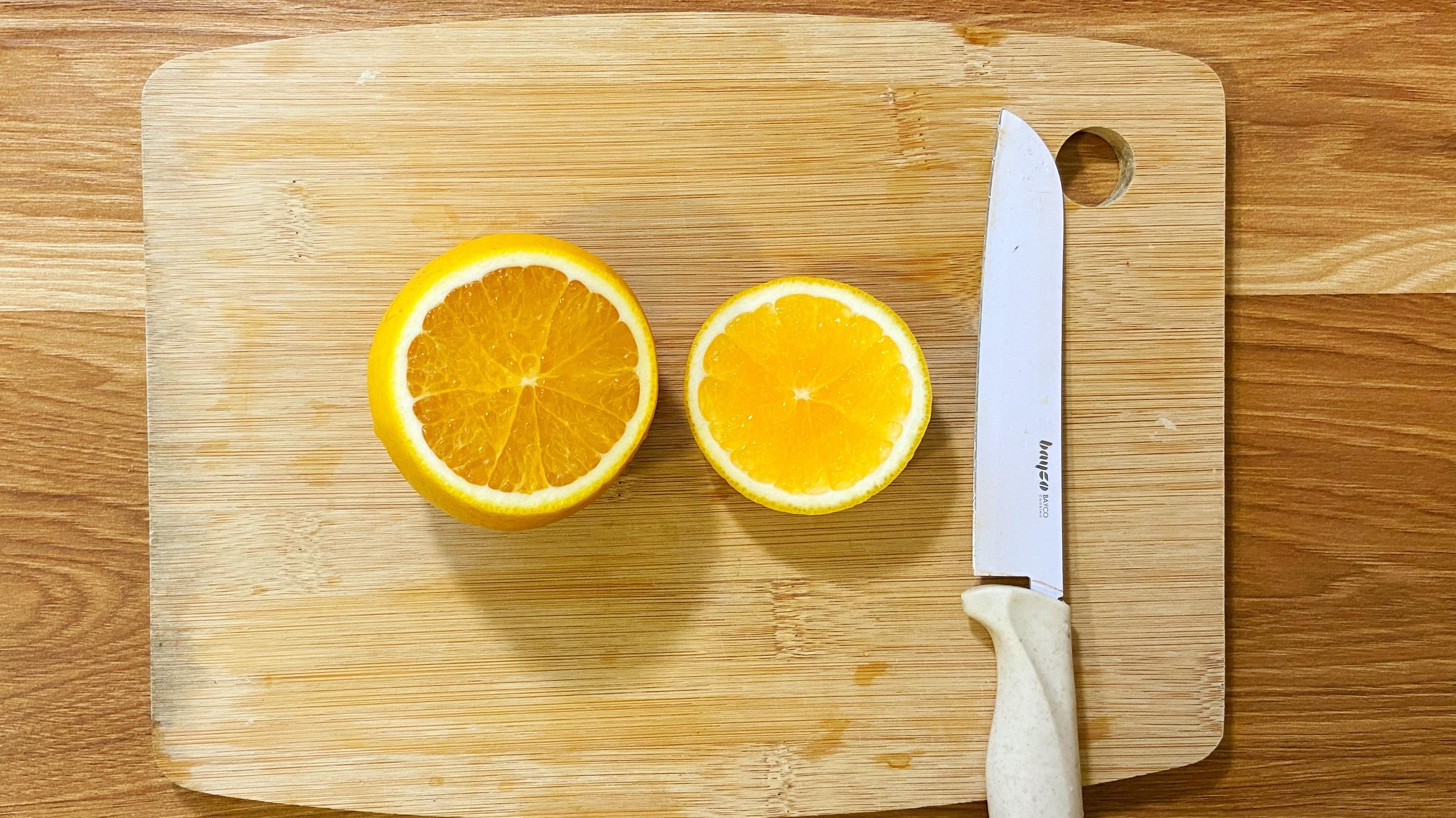 2、從橙子的三分之一處切開,切下的部分當作橙蓋;