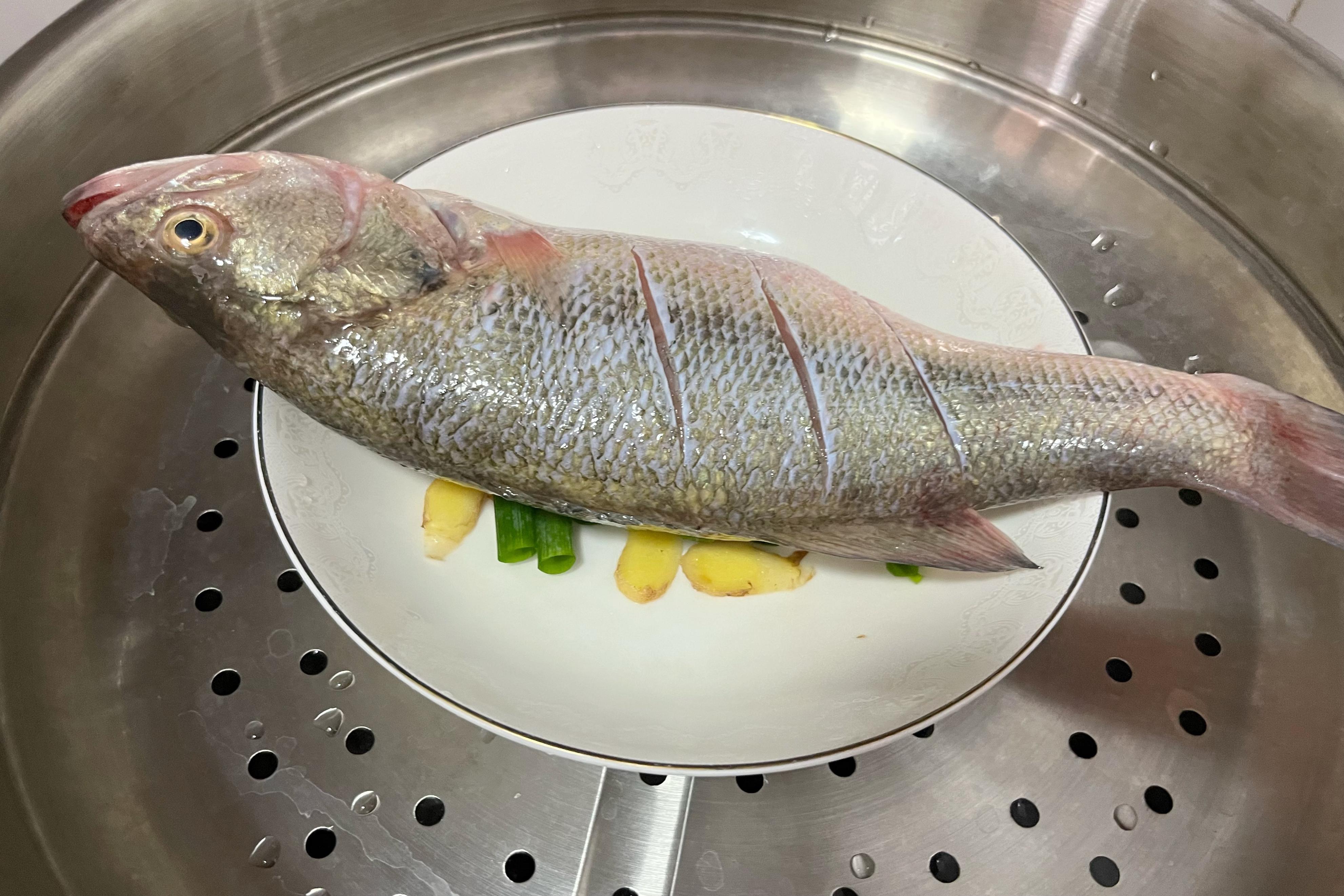 2、蒸盤上墊一層薑片、蔥段,再放入鱸魚,中大火隔水開蒸;