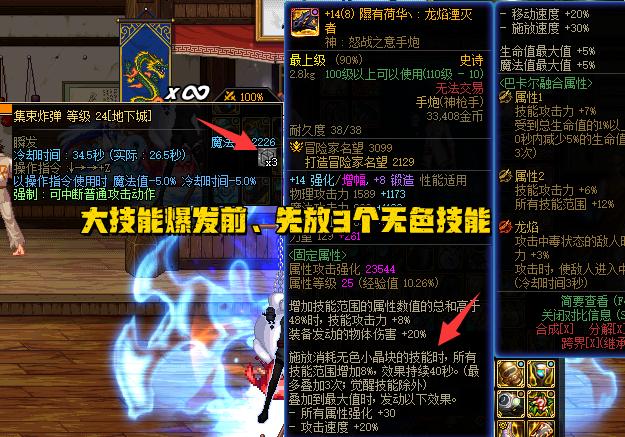 【暖機原理】當技能範圍總和高於48%時,技能攻擊力+8%;而武器本身自帶的24%技能範圍,需要釋放3個無色技能才能觸發!
