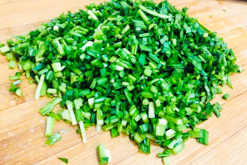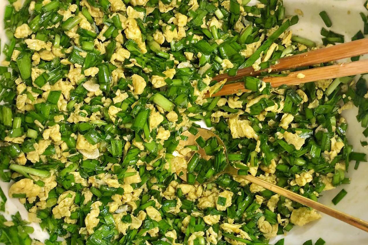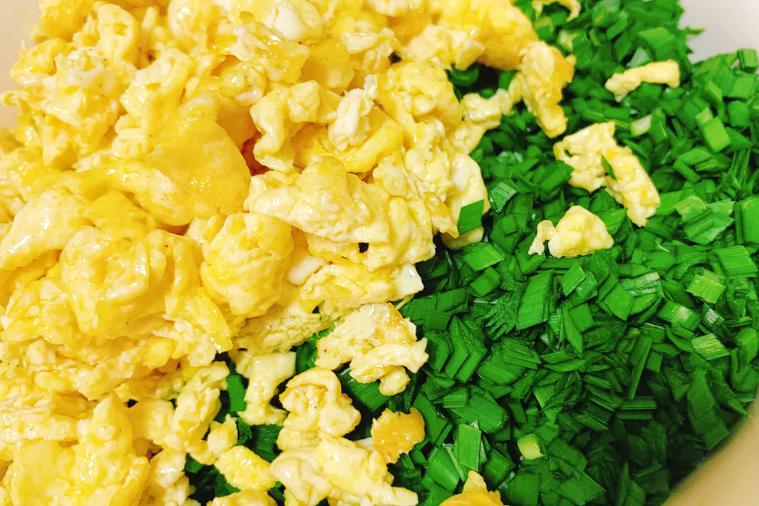 1、韭菜洗淨,控幹水分後切末,再加1勺香油,攪勻鎖住水分;
