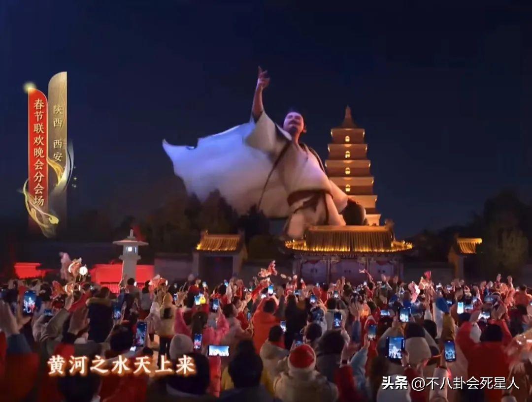 西安分會場也很絕,李白在空中對酒當歌,千人一起朗誦《將進酒》,“君不見黃河之水天上來,奔流到海不復回”,豪放灑脫,蕩氣迴腸,展現了華夏兒女的自豪感。
