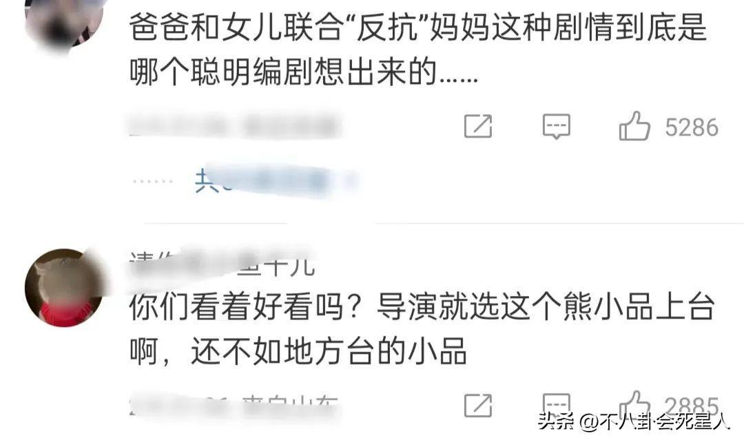 另外,小品《那能一樣嗎》被說尷尬,節目上演了“雙標”媽媽和“反抗”父女的故事。