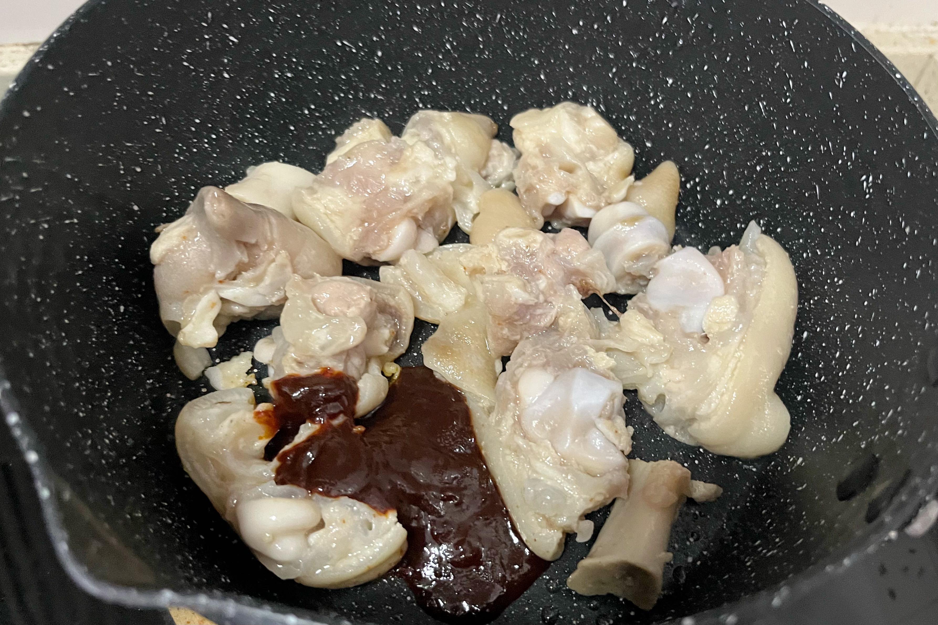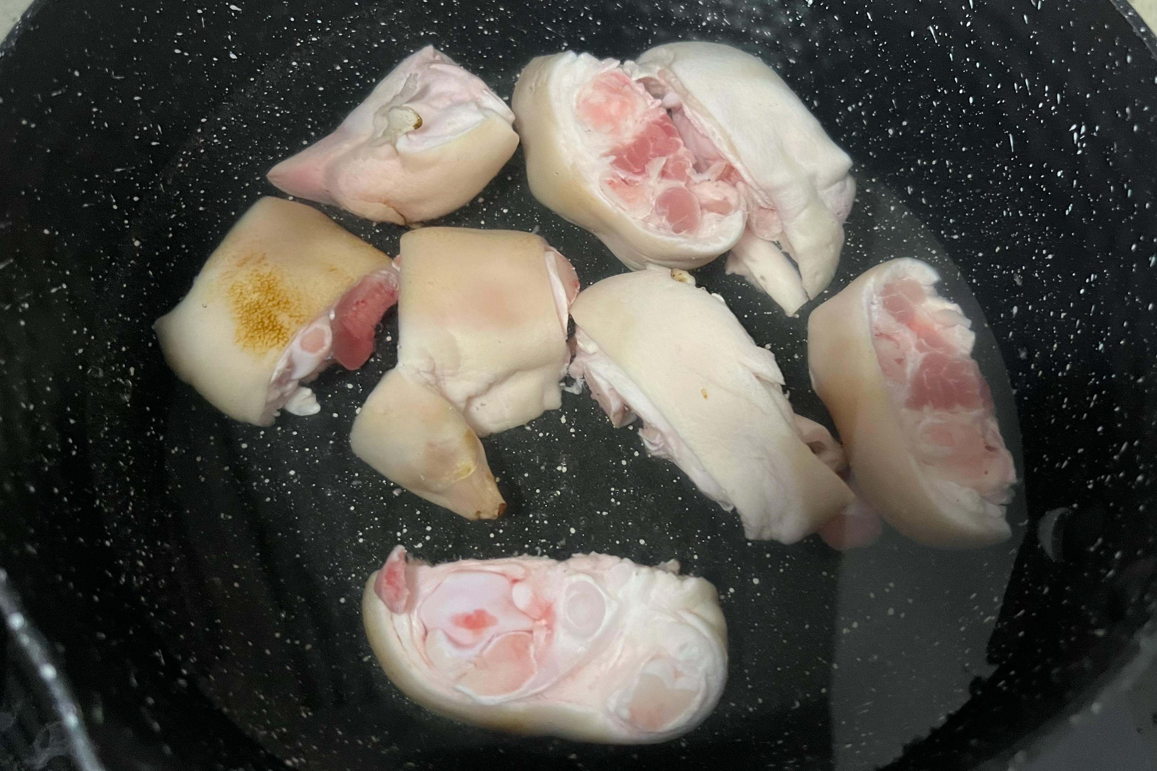 5、翻炒1分鐘後,加入適量熱水,水要能沒過豬手;