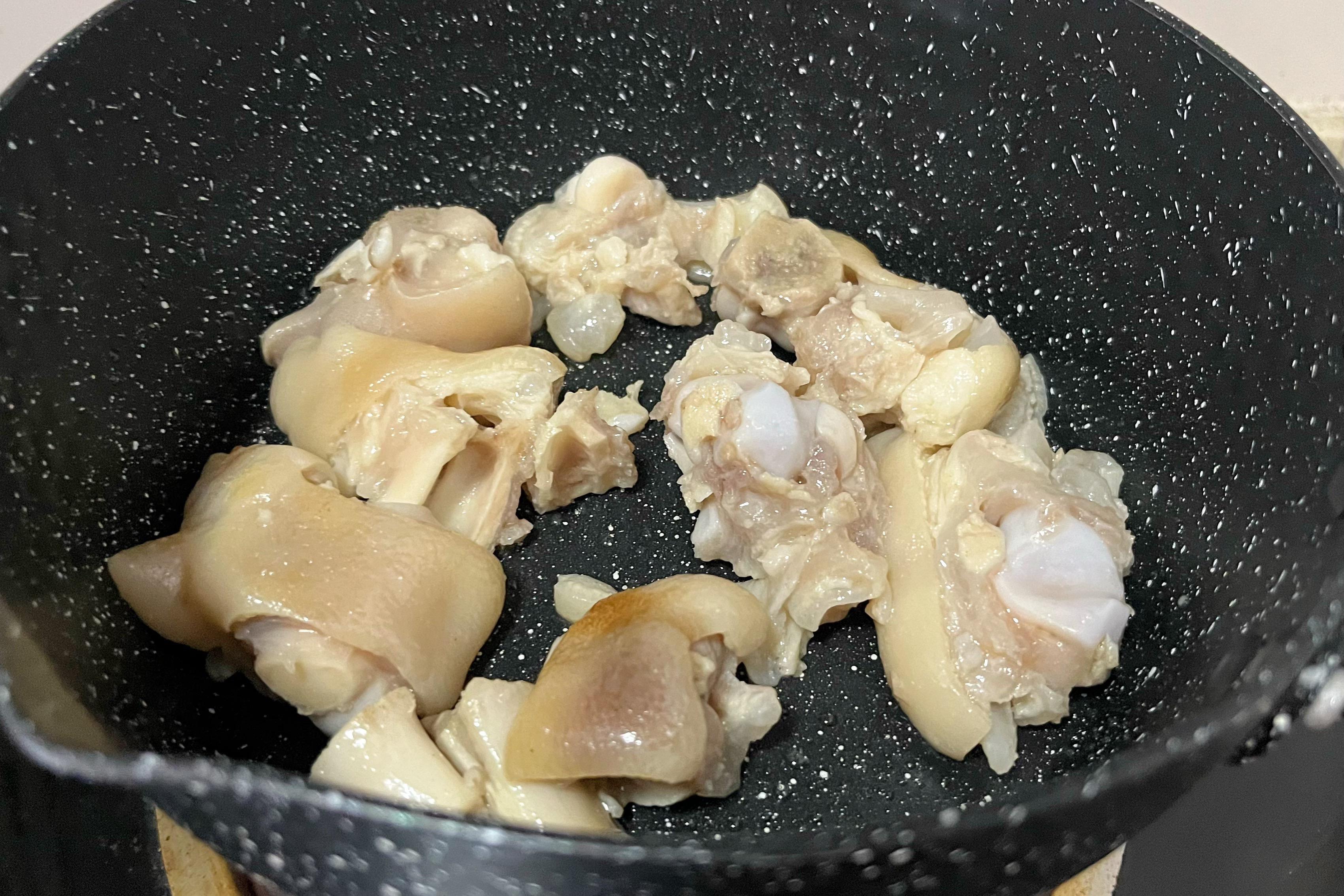 3、另起鍋加油,倒入煮好的豬手,小火炒至表面微微泛黃;