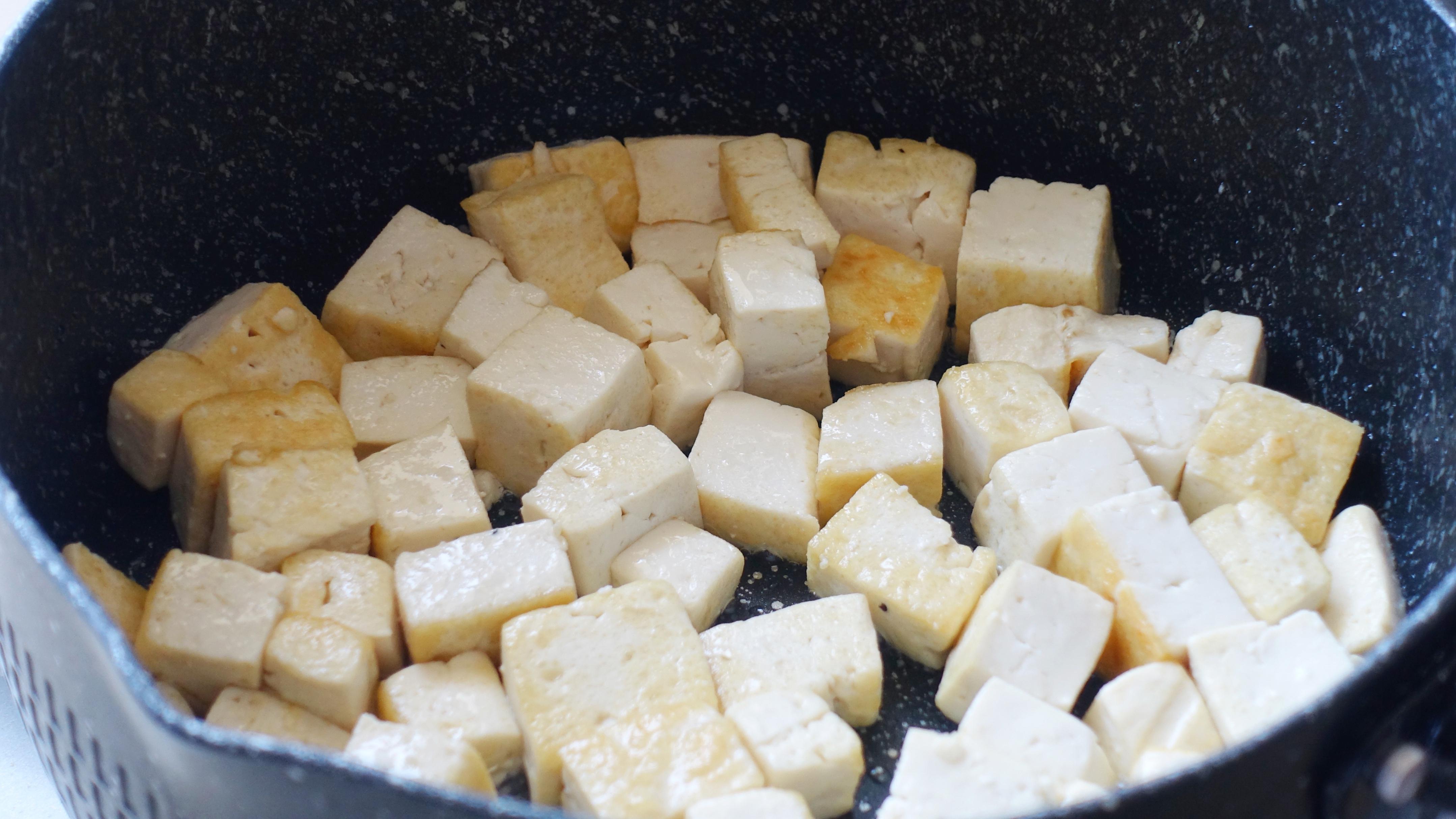3、鍋中加油,先下豆腐,小火煎至表面微微焦黃;