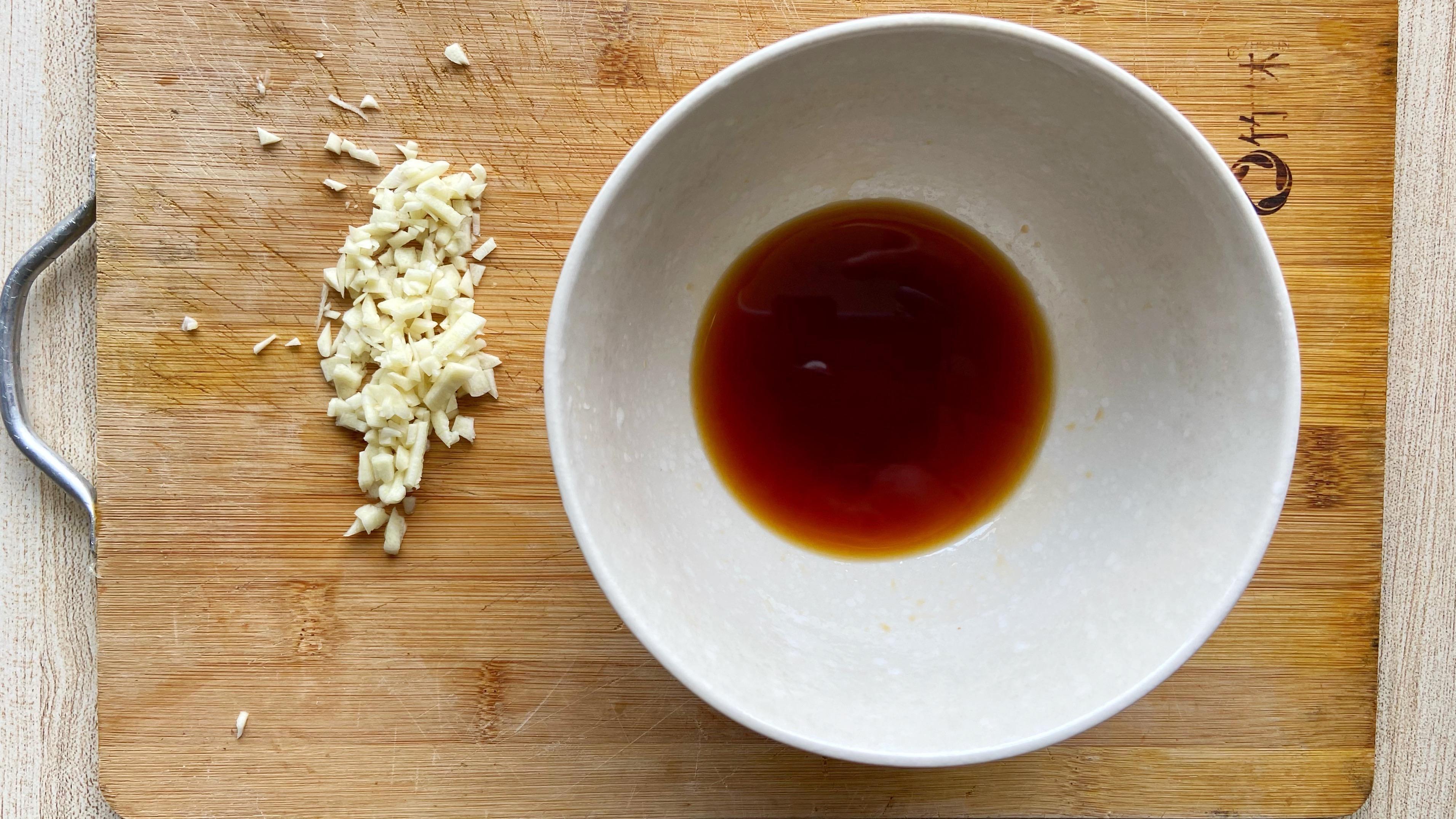 3、碗中加些生抽、蠔油,攪勻成料汁,再將蒜末下油鍋炒香;