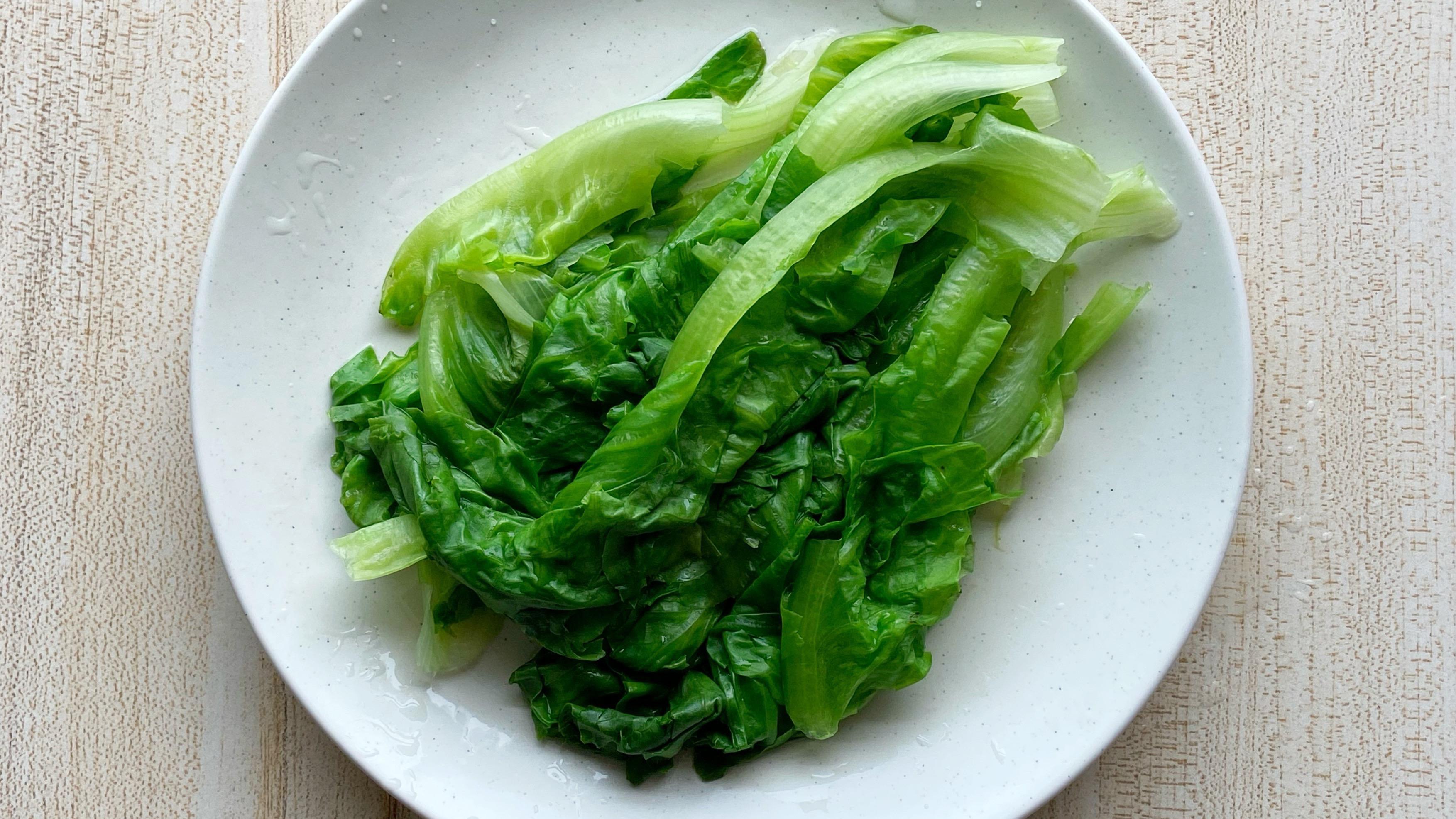 2、燒一鍋水,水開後下生菜,焯燙50秒後,控幹水分盛盤;