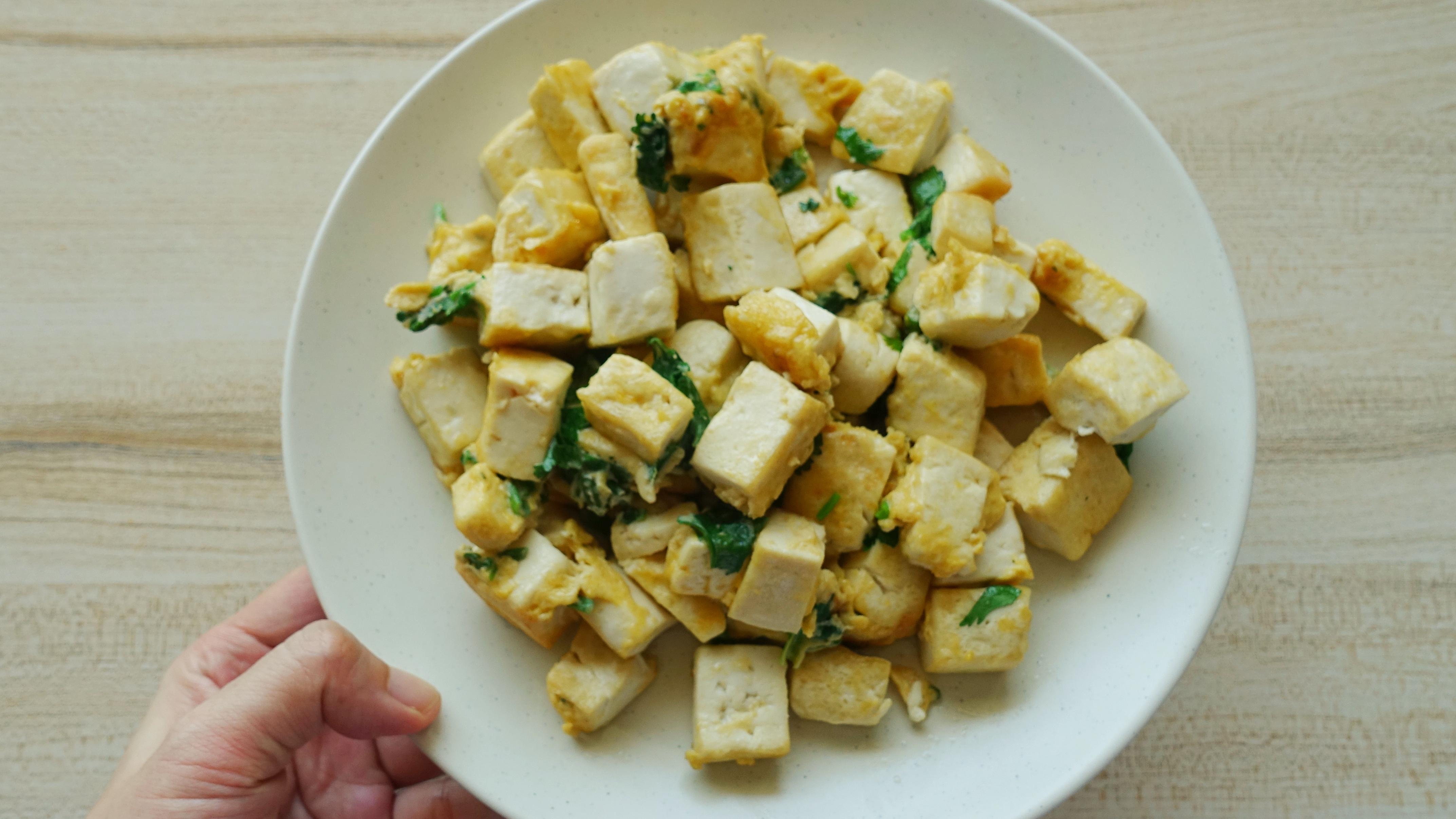 5、小火煎至蛋液凝固後,翻炒幾下,即可出鍋享用。