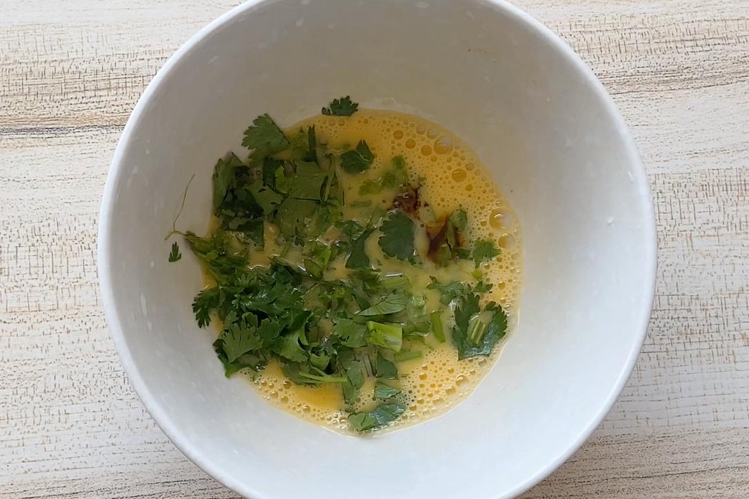 2、雞蛋2個,敲入碗中攪勻,再加些香菜碎、食鹽、香油進去,攪拌均勻;