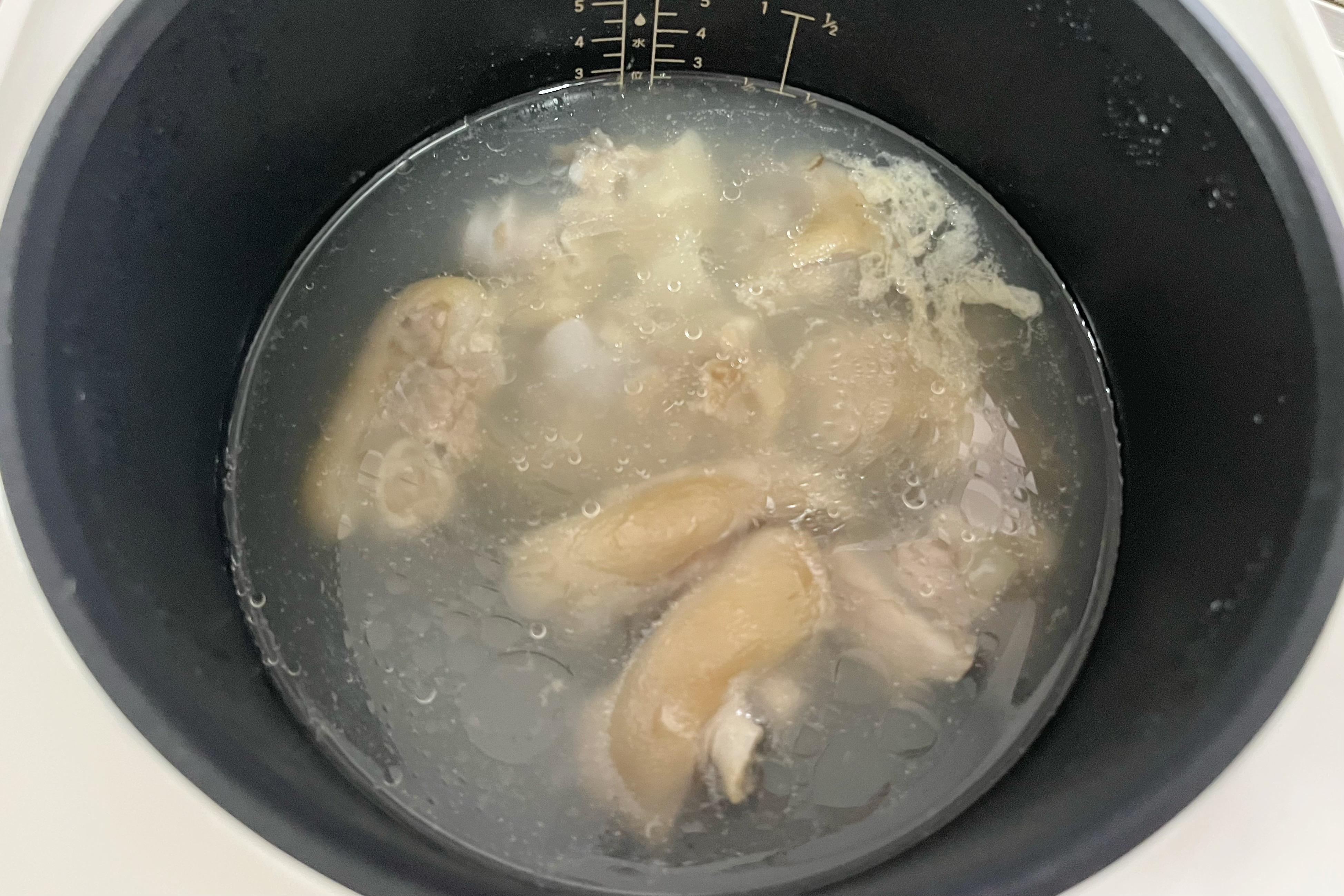2、將豬手倒入高壓鍋中,加適量熱水,煮30分鐘,將豬手煮至軟糯;