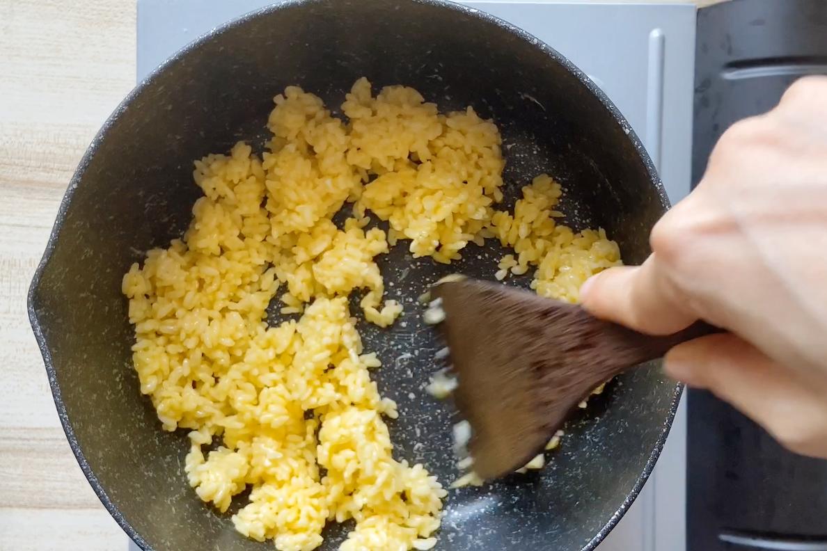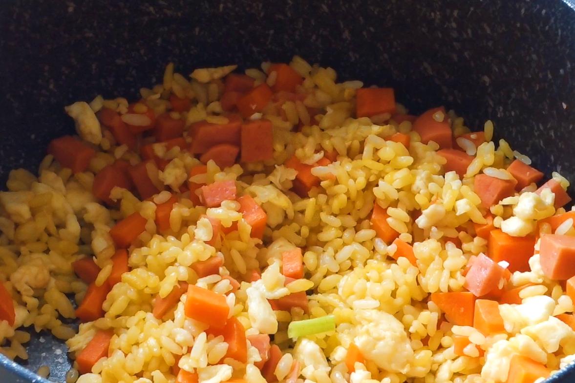 4、另起鍋燒油,倒入剩米飯,不斷翻炒至顆粒分明;