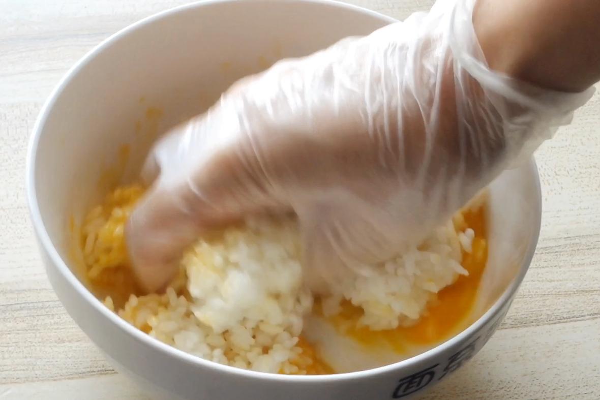 2、將剩米飯倒入蛋黃碗中,用手抓拌均勻;