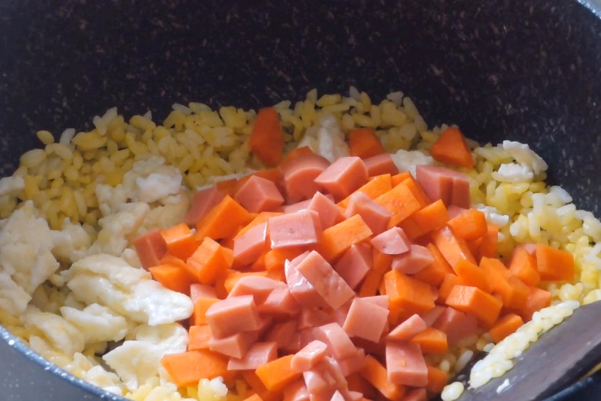 5、倒入蛋白和剩菜,我放了胡蘿蔔丁、火腿丁;